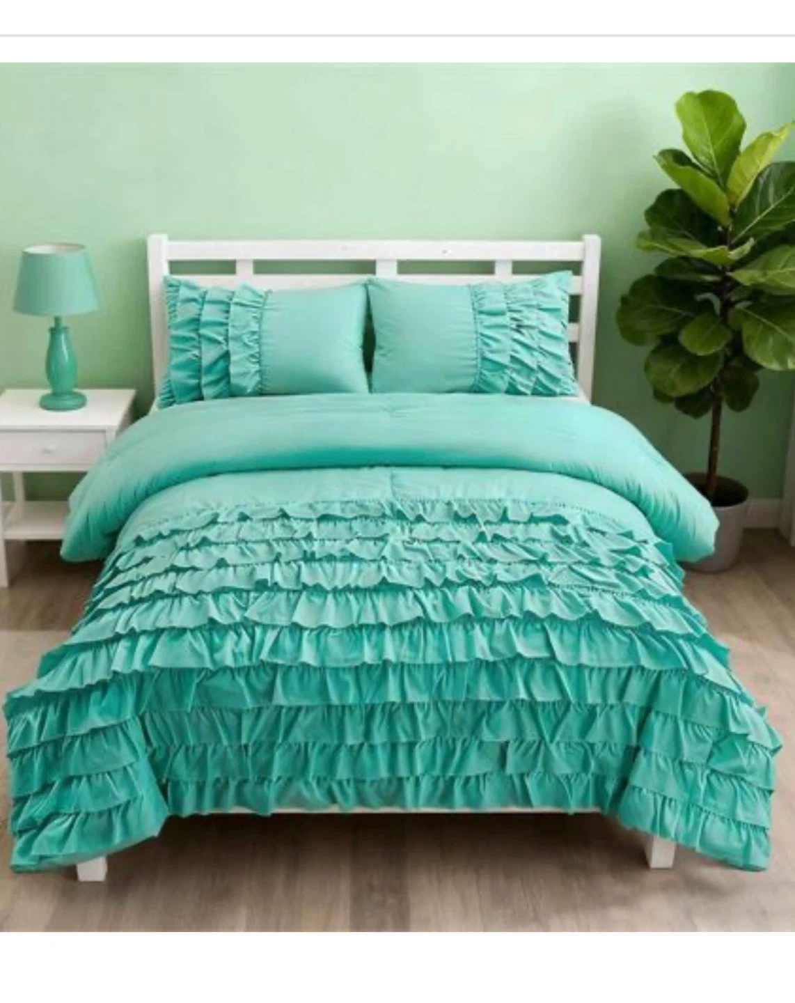 This teal duvet cover set features a stylish ruffled design. It includes comforter and 2 pillowcases. Comes in a plastic bag, likely for protection during shipping or storage.