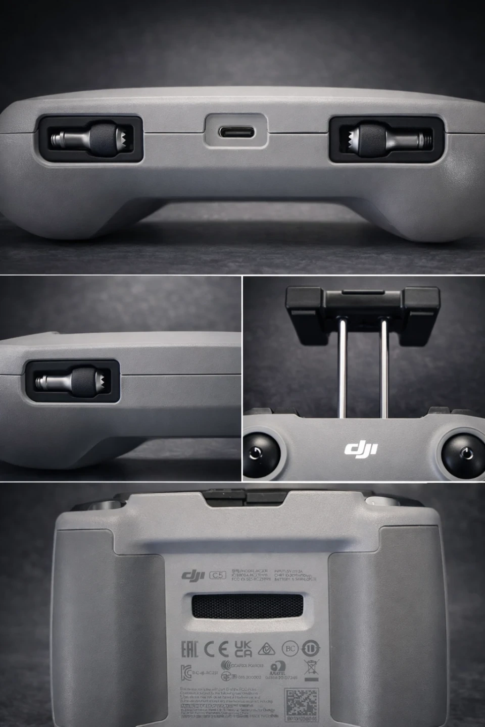 This is the DJI RC-N1 remote controller. It's designed for compatible DJI drones. The controller features an integrated smartphone mount and precise control sticks.