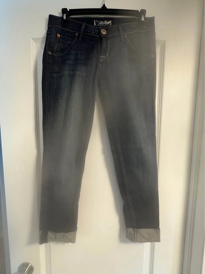 - Dark blue Hudson capri jeans.