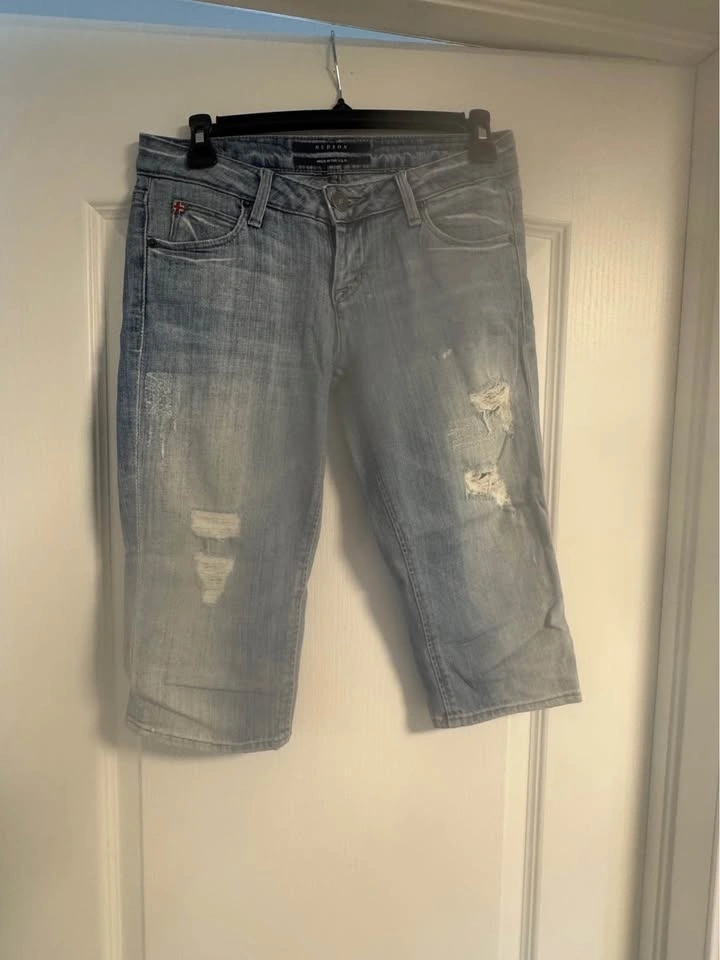 - Light blue distressed Hudson capri jeans.