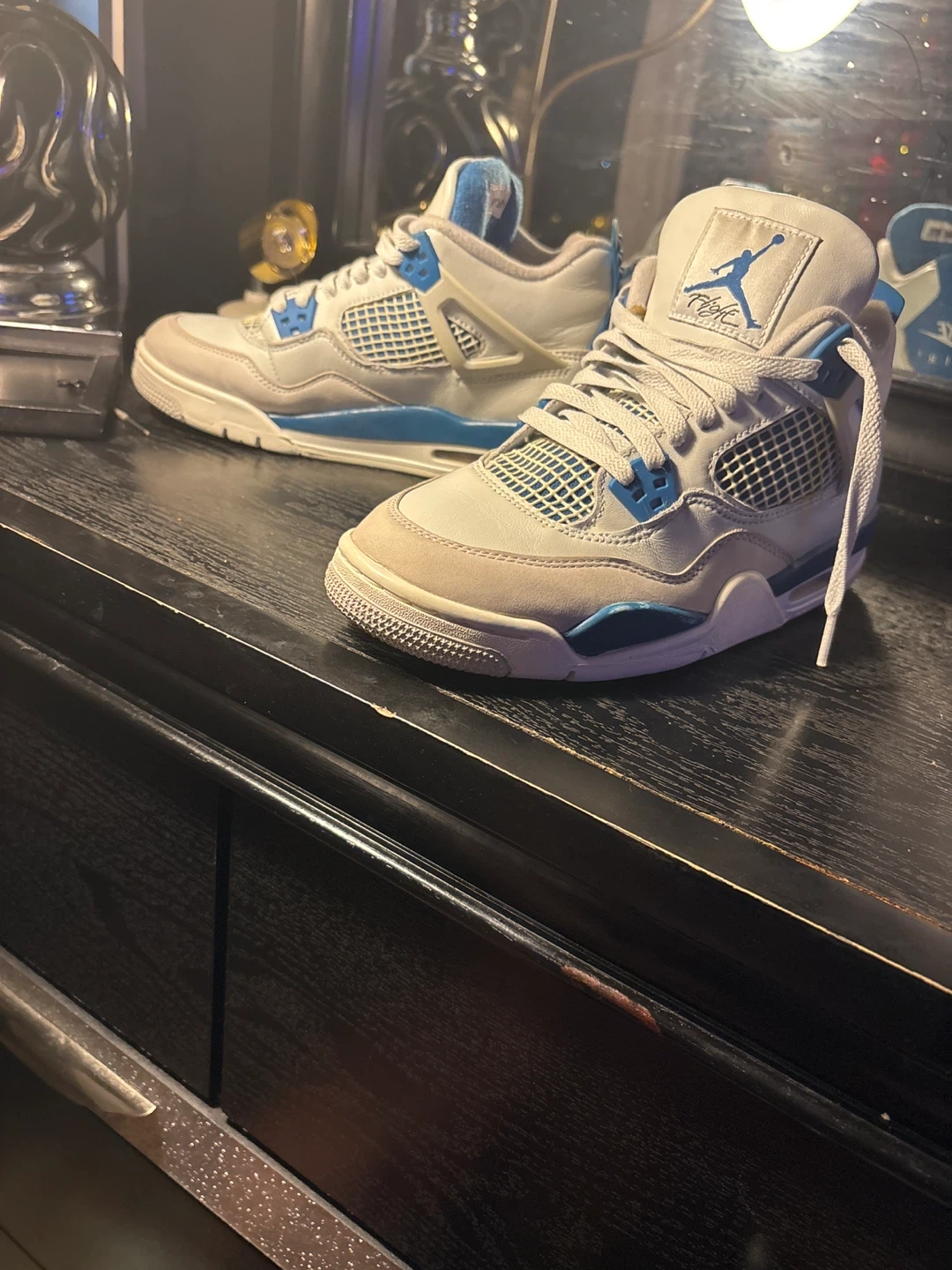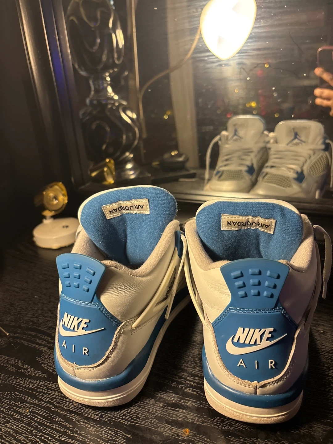 Selling a pair of Nike Air Jordan 4 Retro sneakers in white and teal. These are in great condition and ready for a new owner! They feature the classic Nike Air logo on the back.