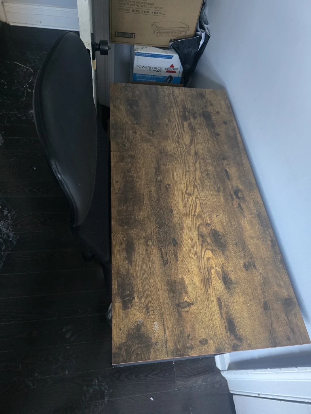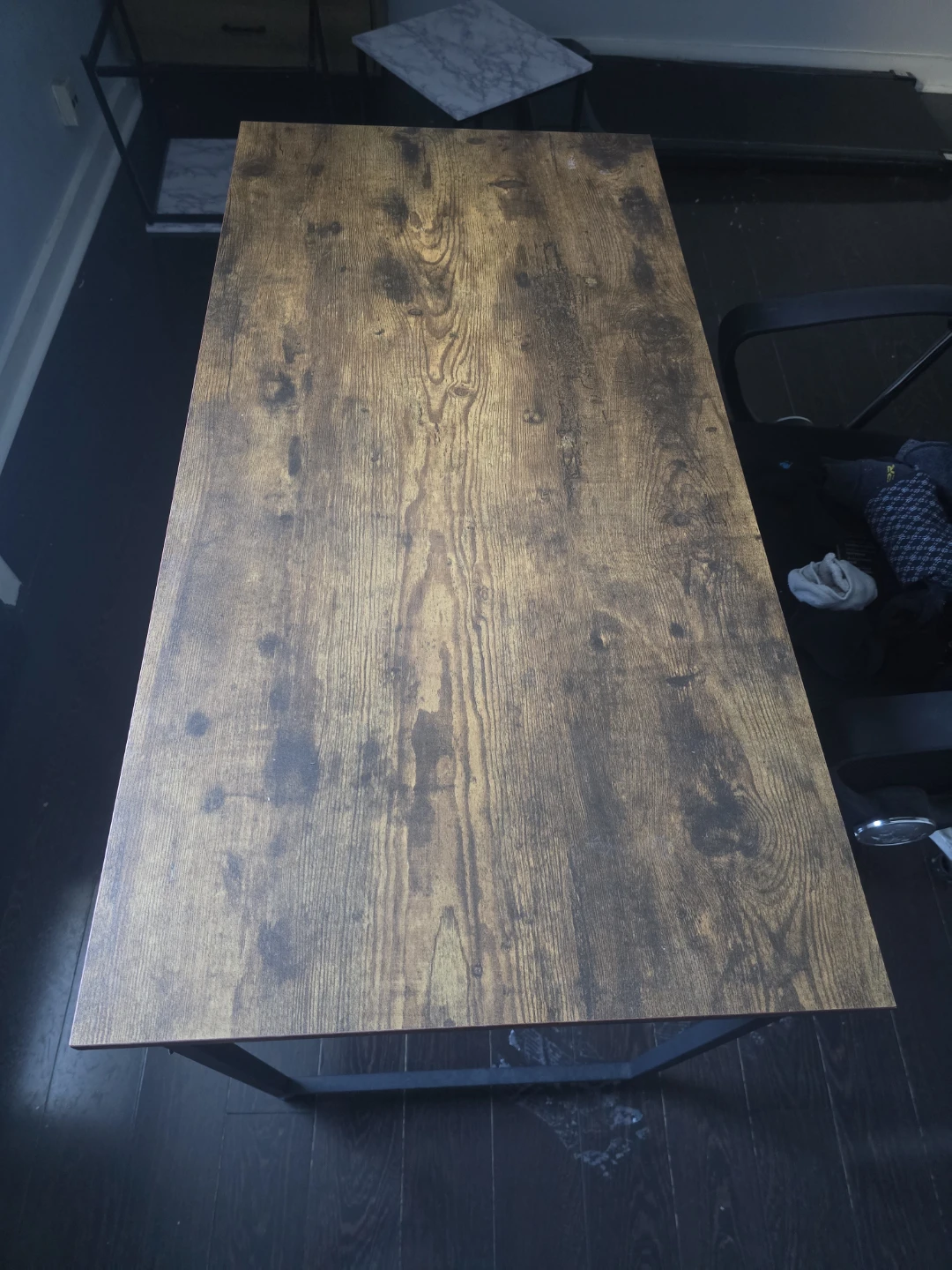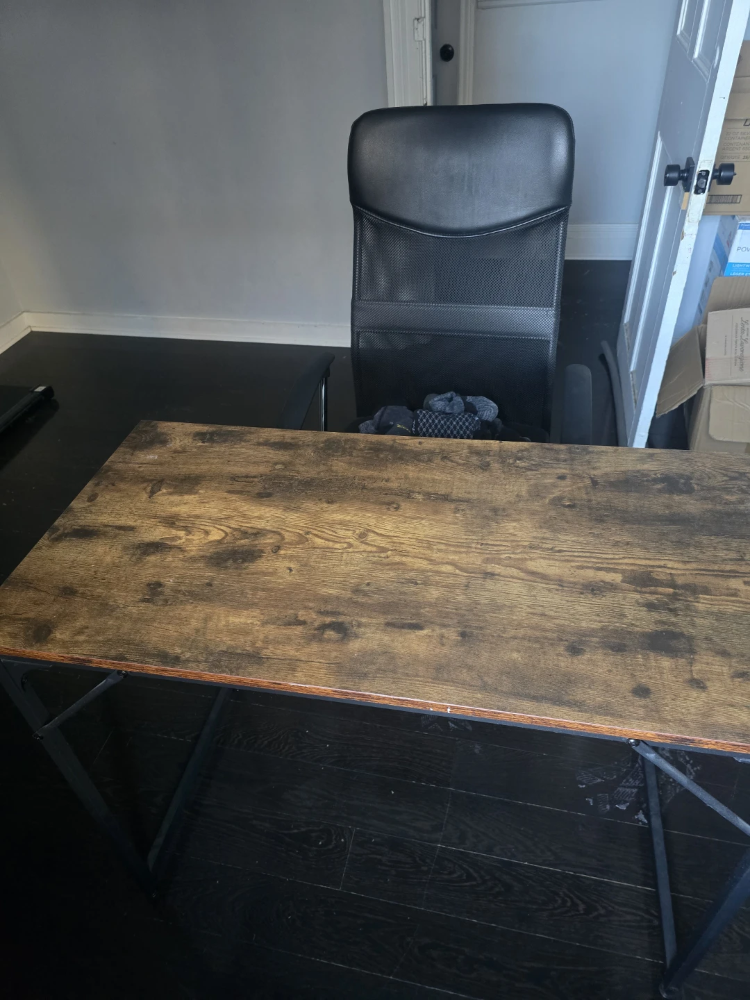 This desk features a rustic wood-look tabletop with a durable black metal frame. It's a sturdy piece that fits well in smaller spaces. It's great for a home office or study area!