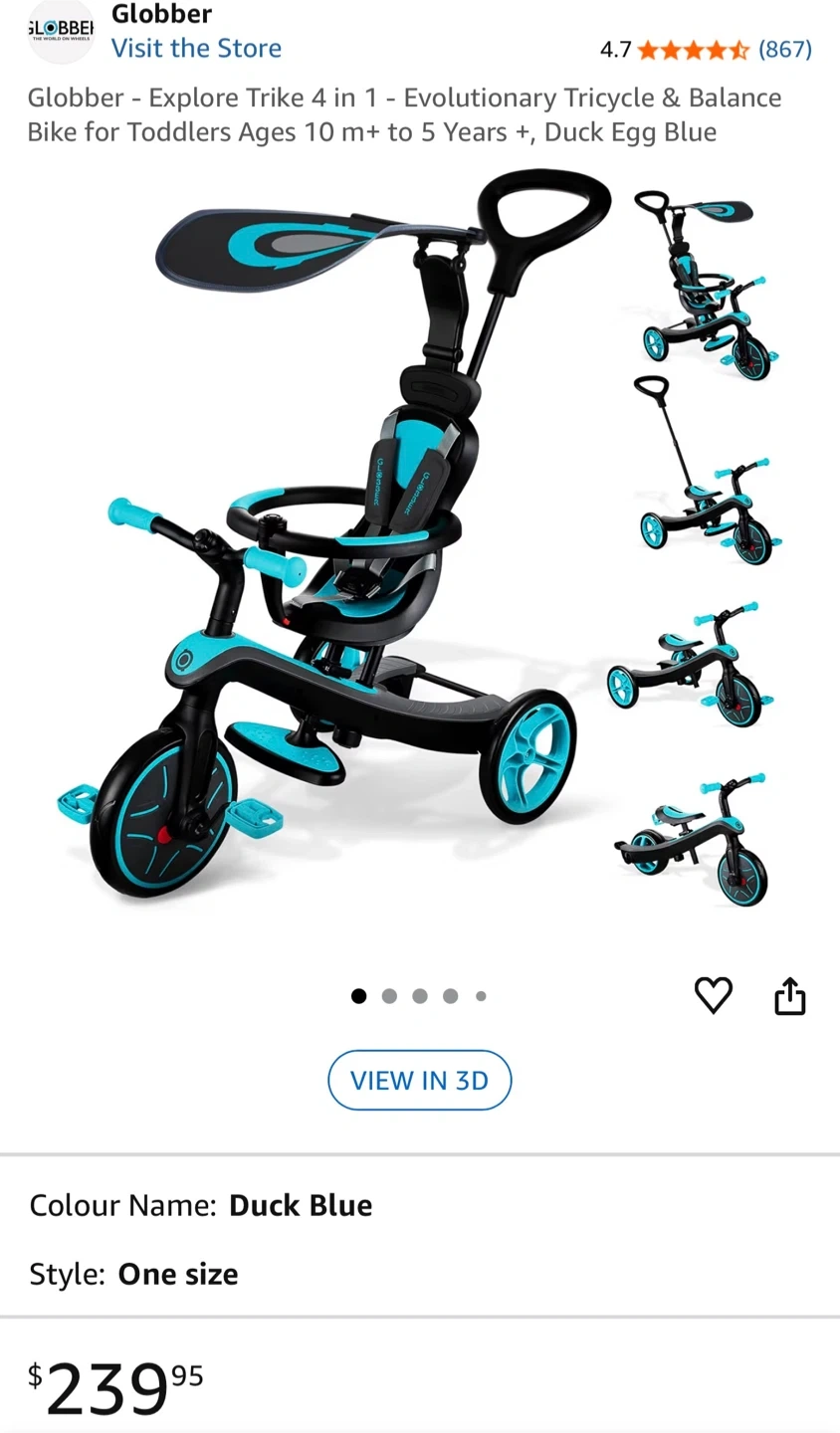 This Globber Explore Trike 4-in-1 is designed for toddlers ages 10 months to 5 years. It's a versatile tricycle and balance bike combo in a stylish Blue colour. It includes a parent push handle and safety harness for younger riders.