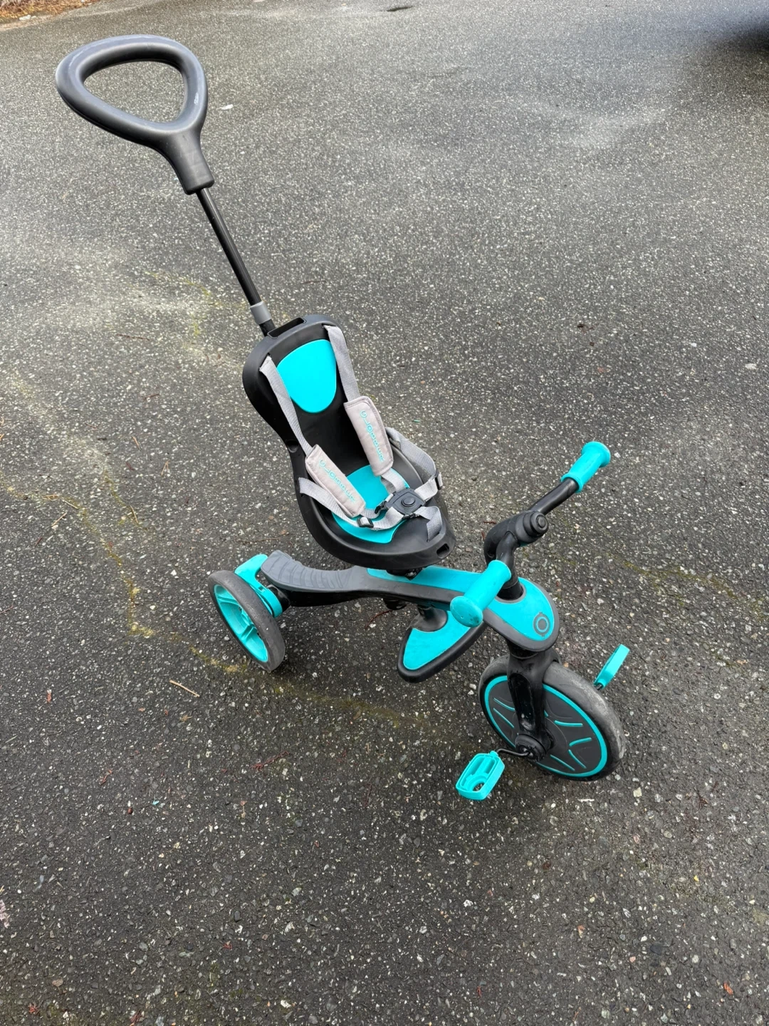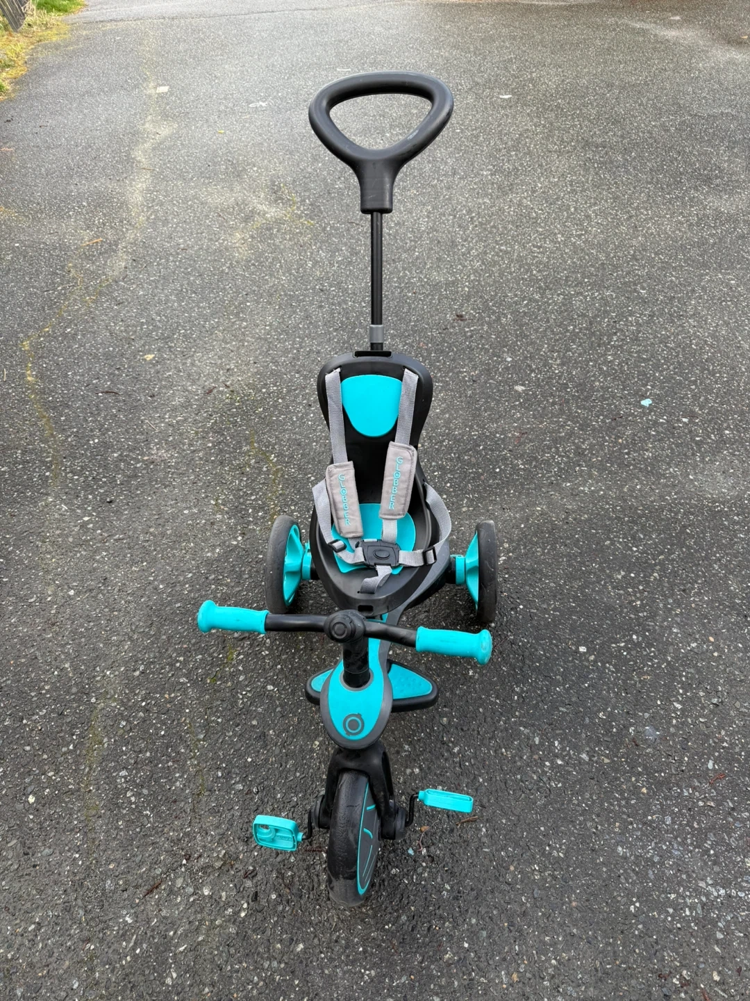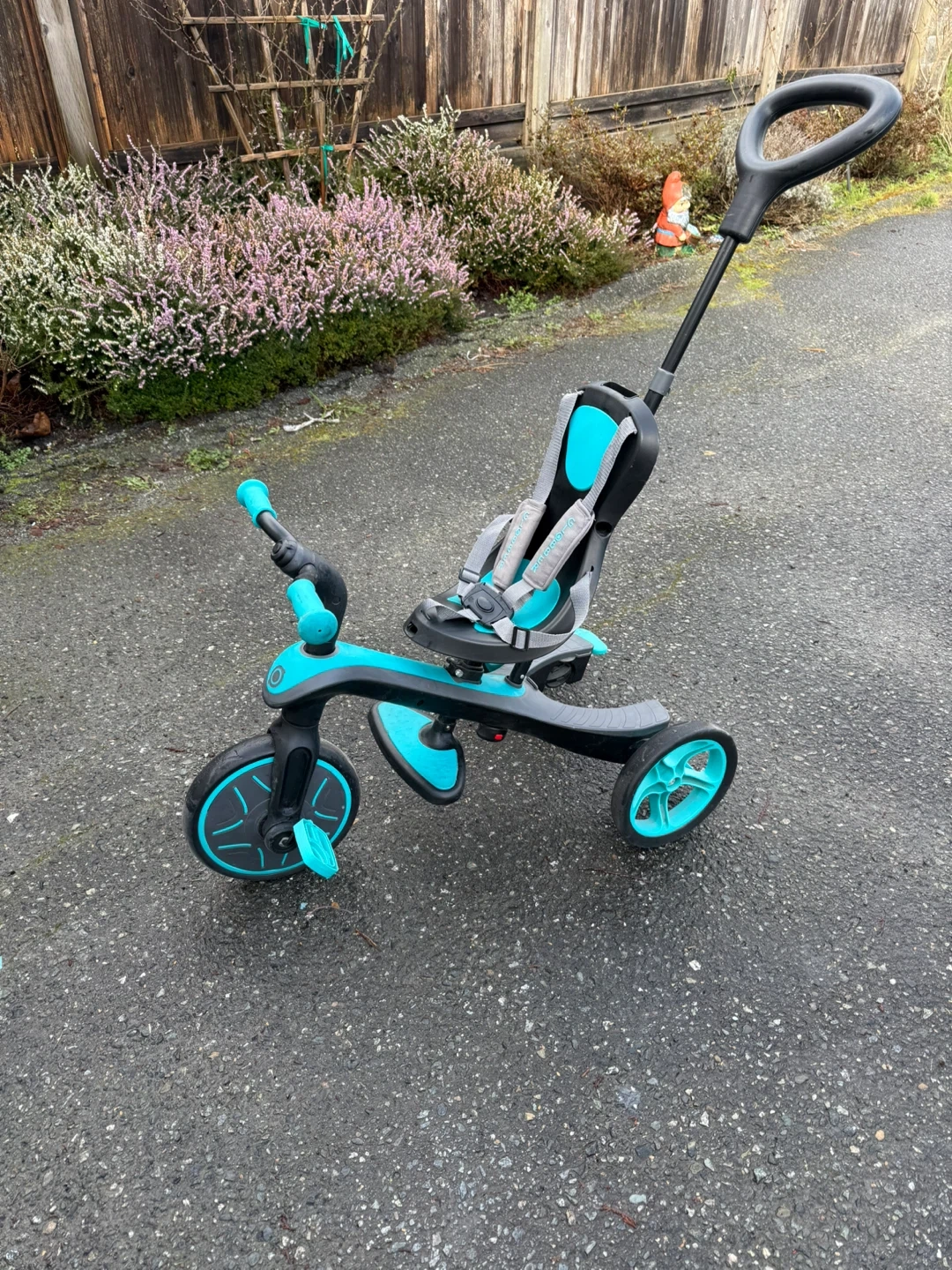This Globber Explore Trike 4-in-1 is designed for toddlers ages 10 months to 5 years. It's a versatile tricycle and balance bike combo in a stylish Blue colour. It includes a parent push handle and safety harness for younger riders.
