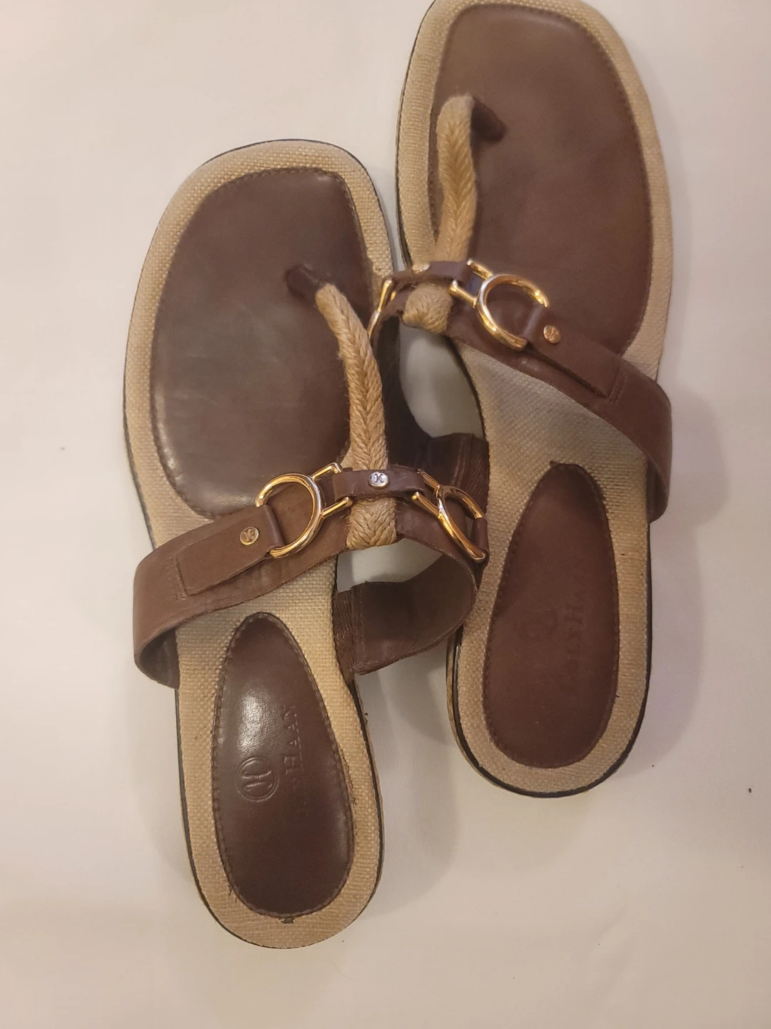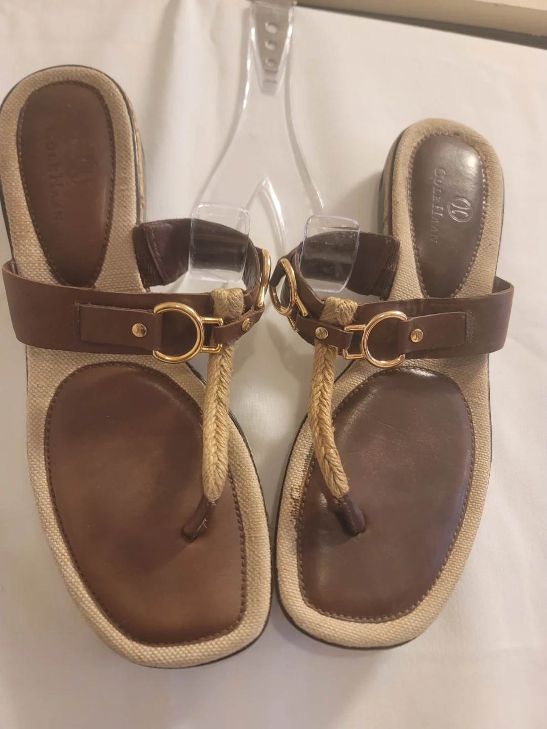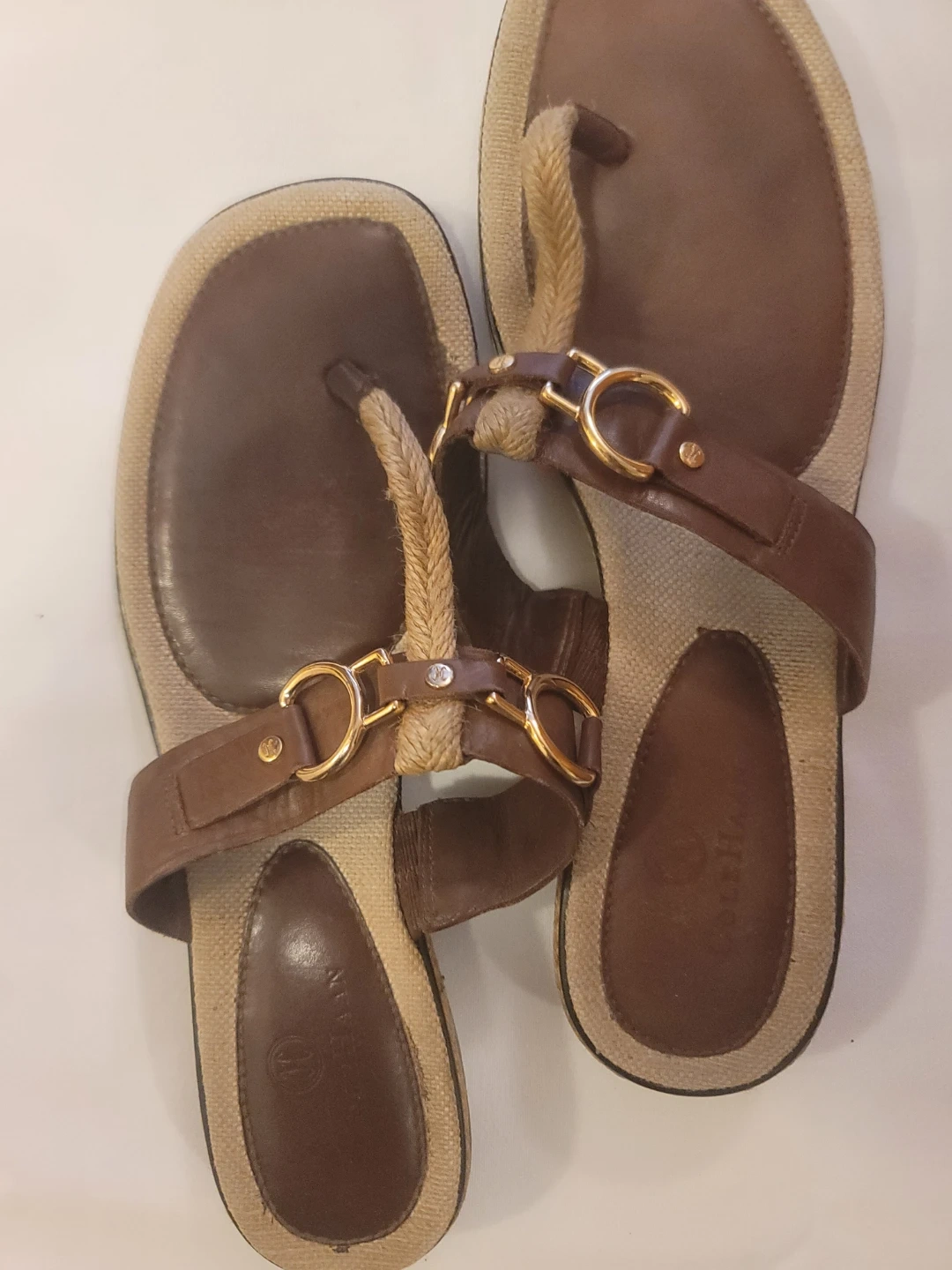 These Cole Haan thong sandals feature brown leather straps with gold-tone hardware. The footbed has a natural woven texture. Comfortable for everyday wear!