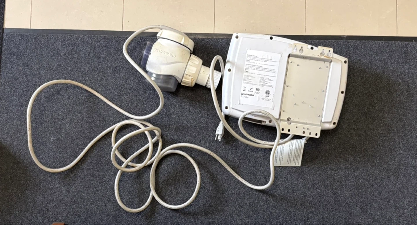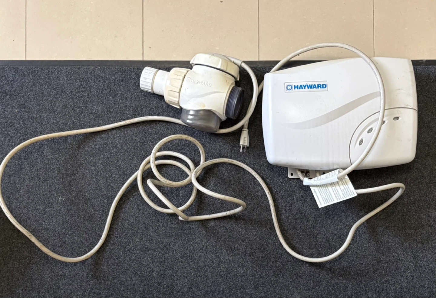 This is a Hayward salt chlorinator for a pool. It's a white unit with a power cord and connecting tube. To be used for an above ground pool.