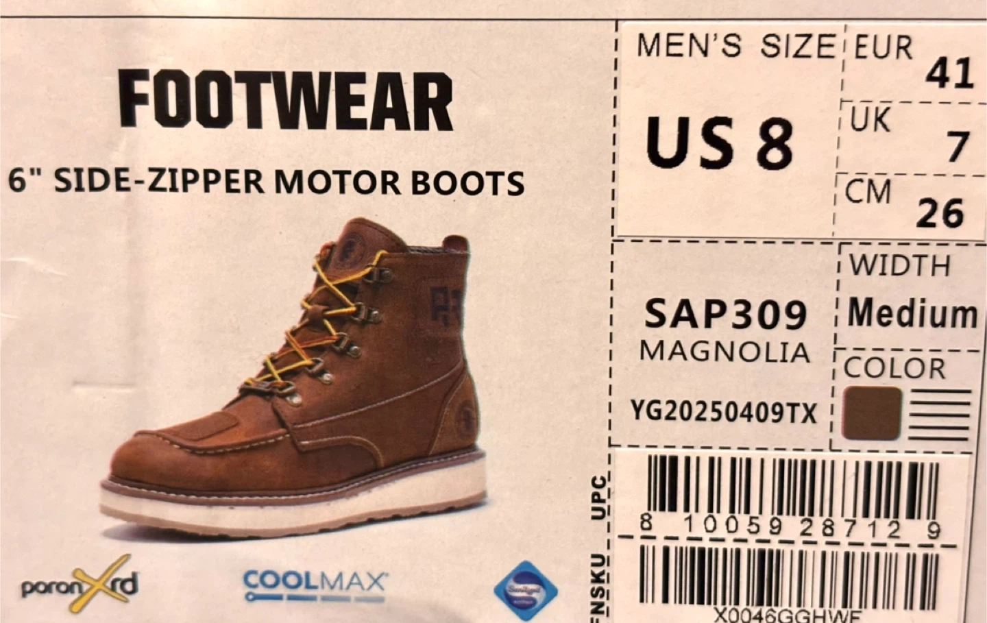 Selling a pair of RR Footwear 6" side-zipper motor boots. These are a men's US size 8, EUR 41, UK 7, and CM 26. The color is Magnolia. The boots are a medium width and feature Coolmax technology. The box is included!