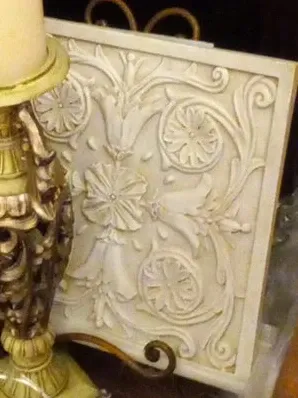 A decorative wall panel featuring an intricate floral embossed design. It's a light cream colour and appears to be made of a resin or plaster material. Originally purchased from The Building Box to hang on fence in my yard. Never got around to it..they've never been outside, so like new.