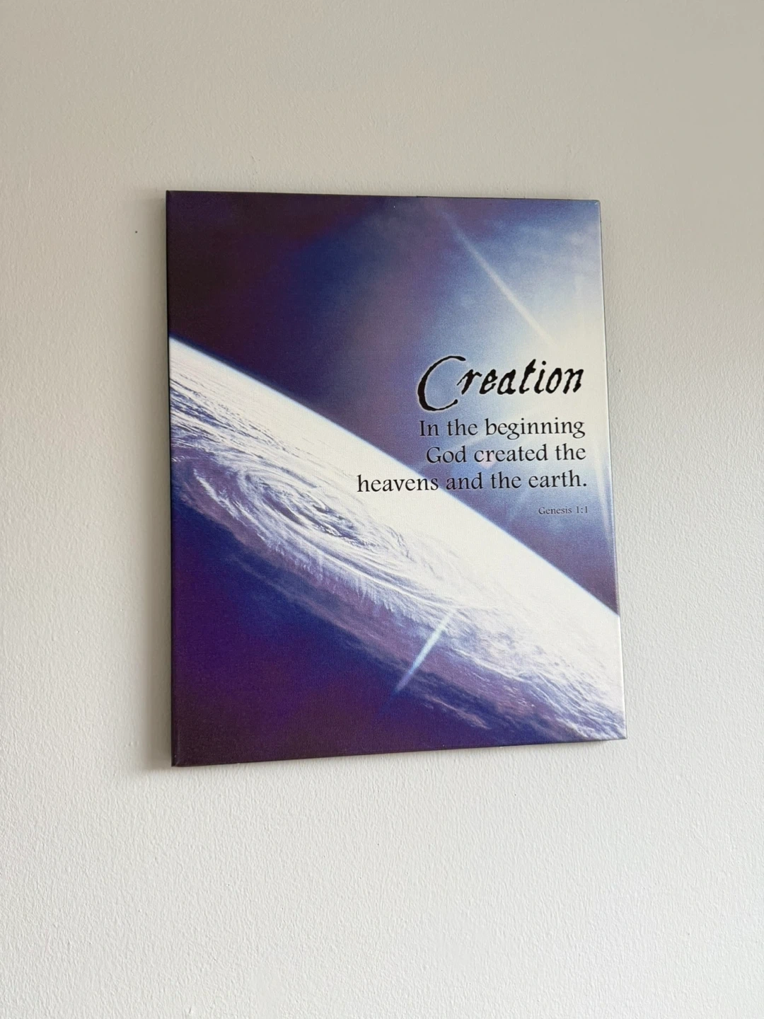 This wall art features the 'Creation' theme with text from Genesis 1:1. It depicts the earth from space. A nice piece for a living room or study or prayer altar