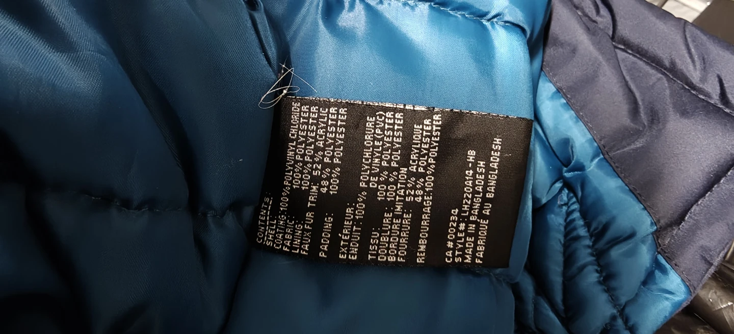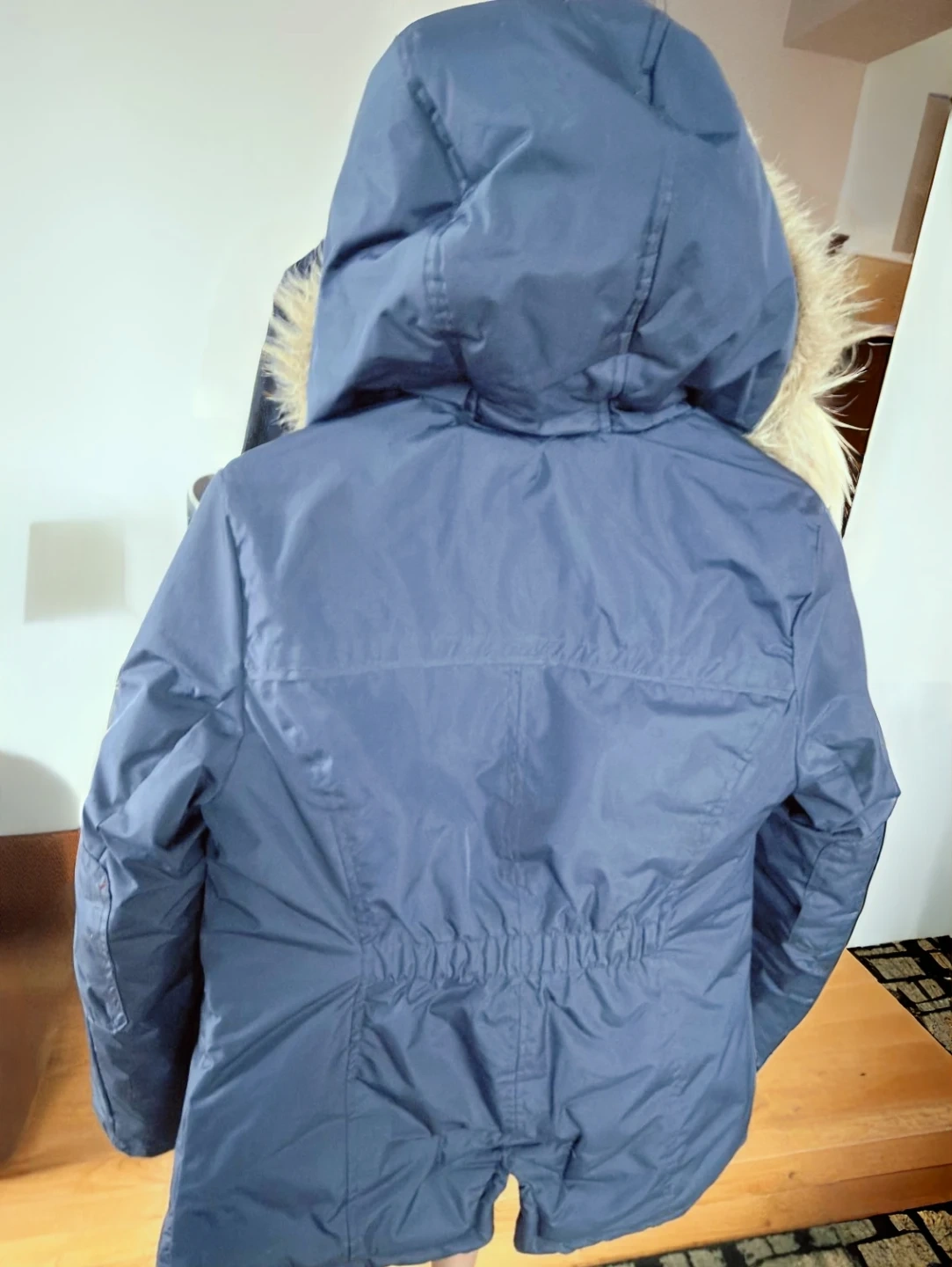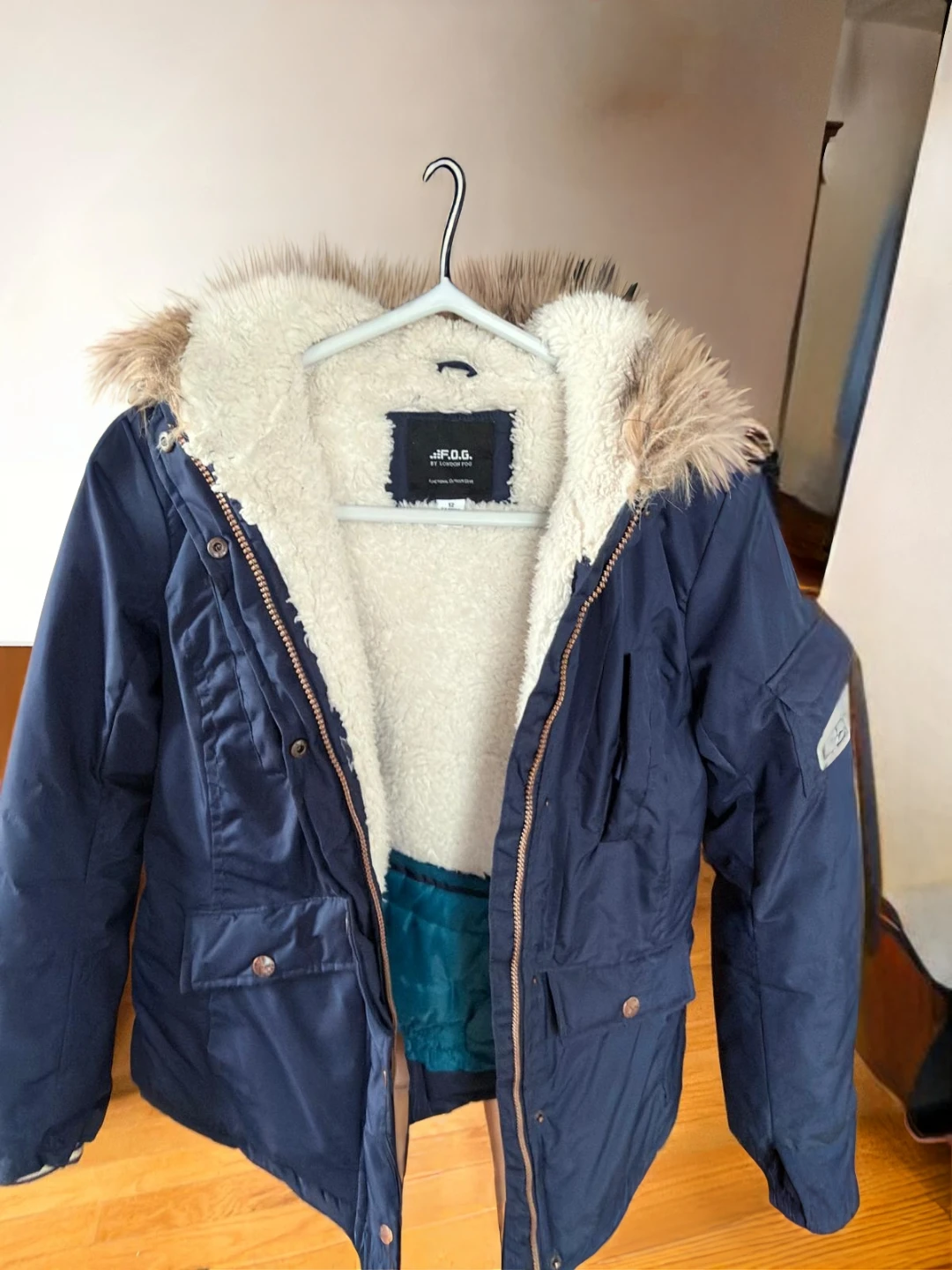 F.O.G. navy blue winter parka with a faux fur trimmed hood. It's lined with 100% polyester shell. This coat is fleece-lined with 52% acrylique and 48% polyester on the inside. Great for staying warm on cold days!