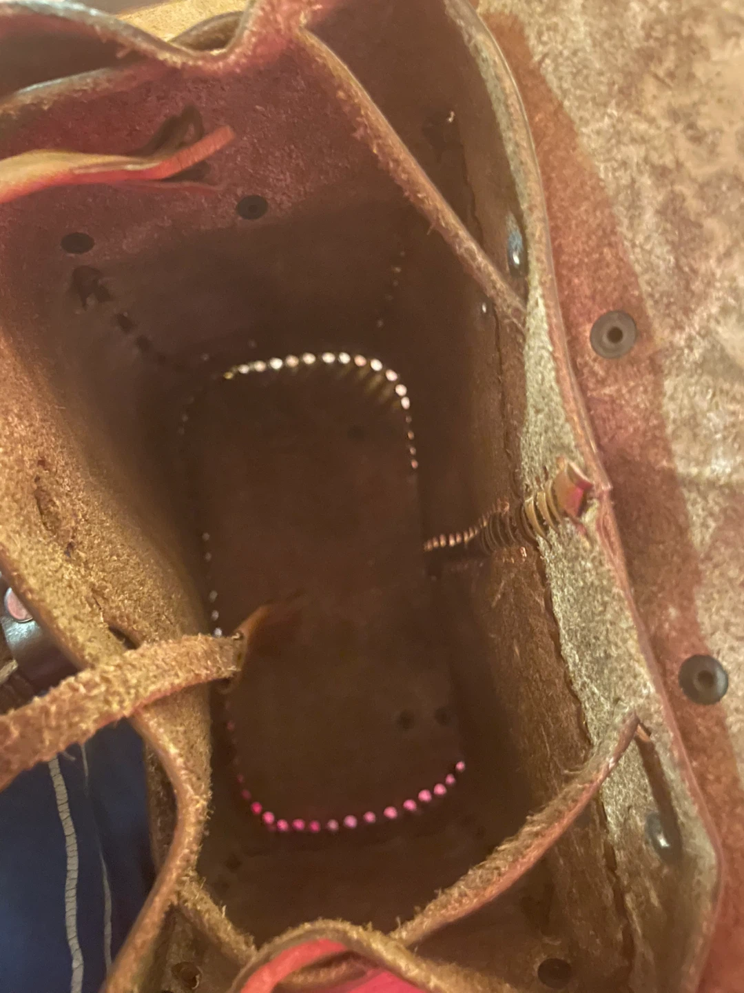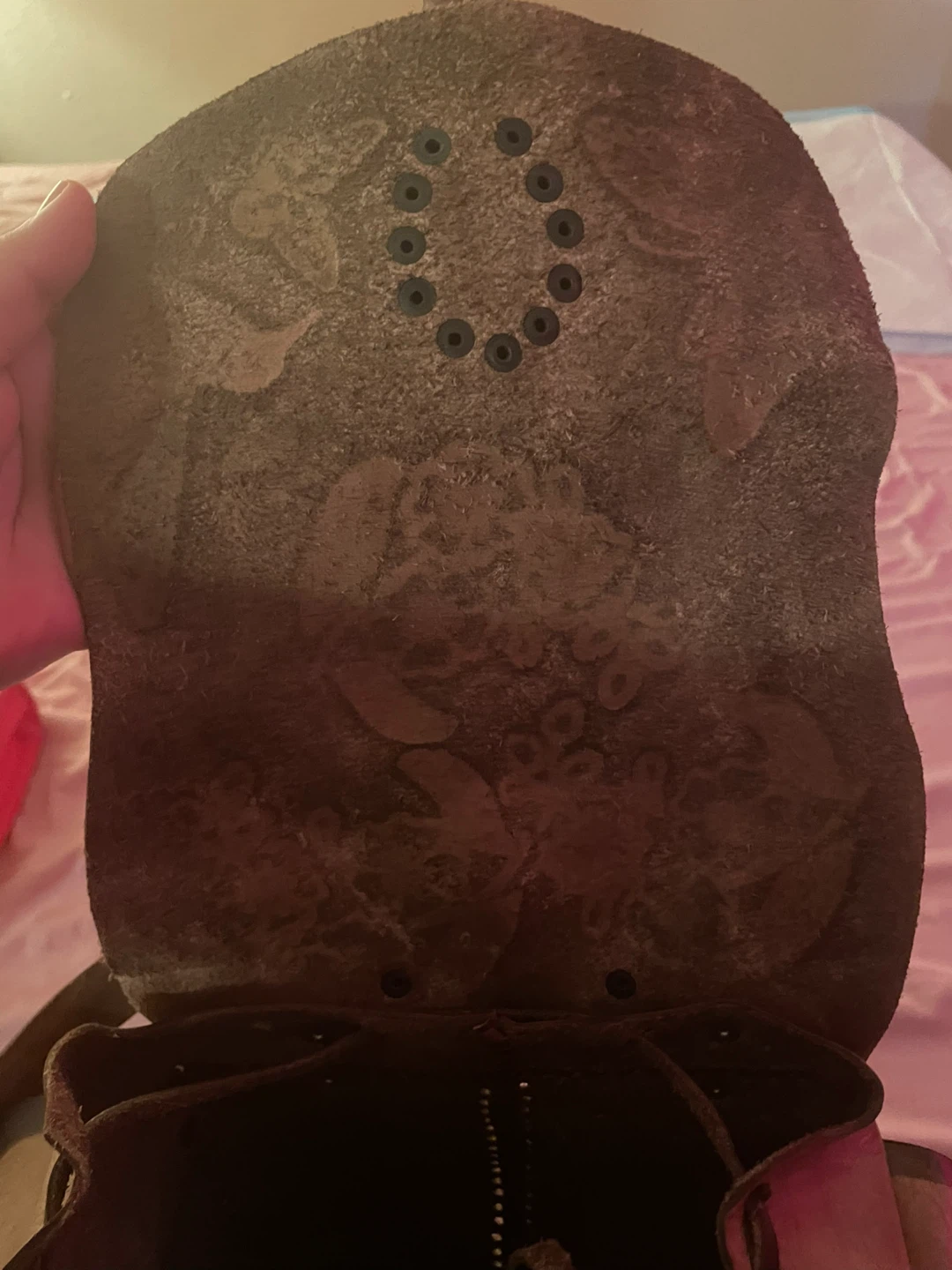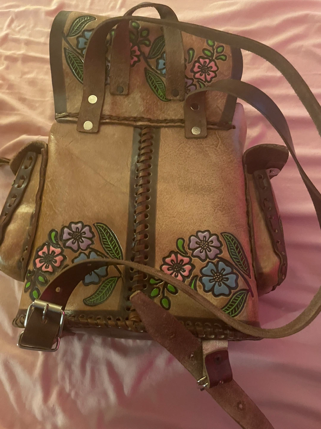 This leather backpack features a beautiful embossed design with colorful flowers, leaves, a butterfly, and a hummingbird. It has adjustable straps and multiple compartments for storage. The intricate stitching and tooling add to its unique look.