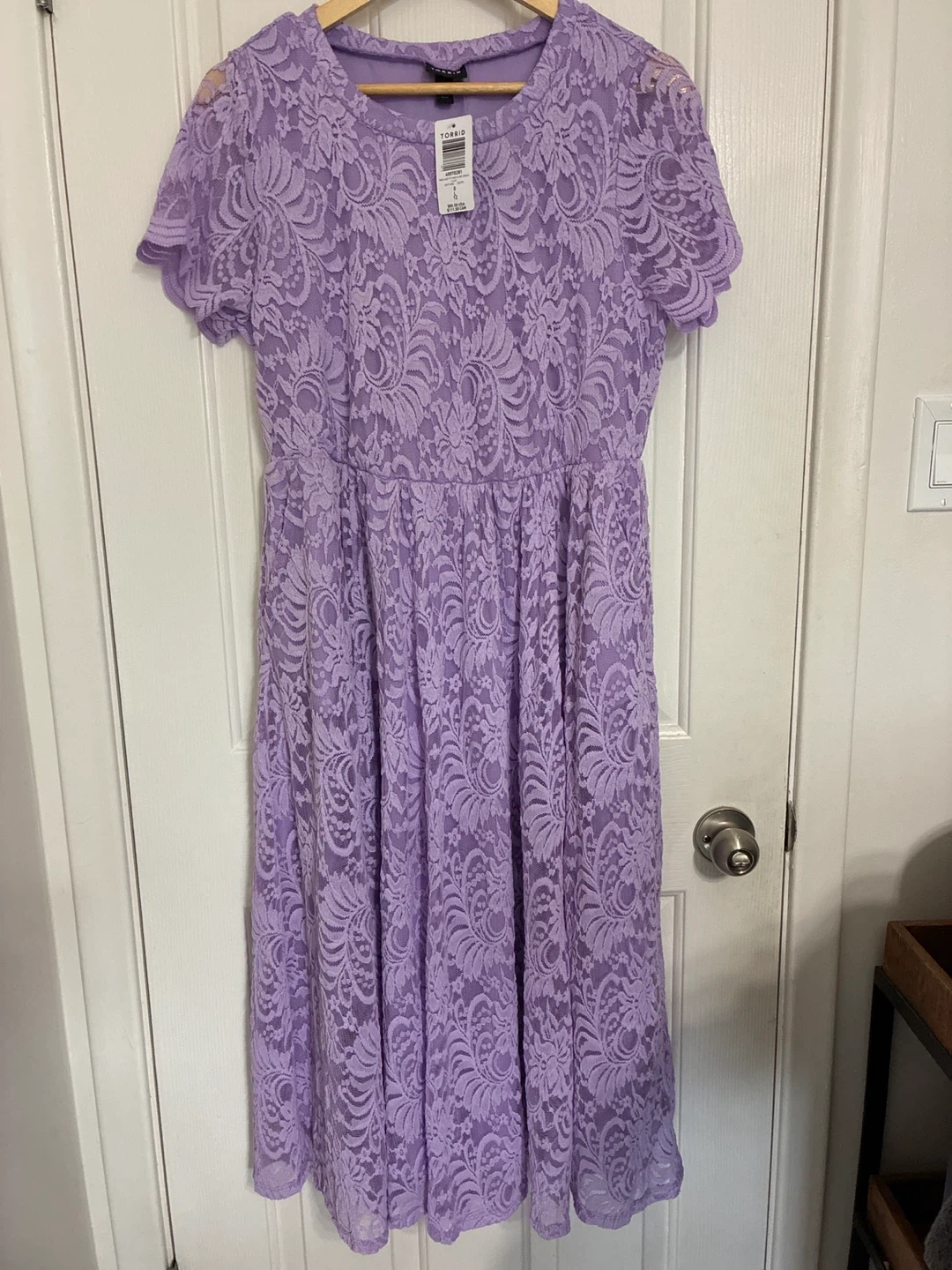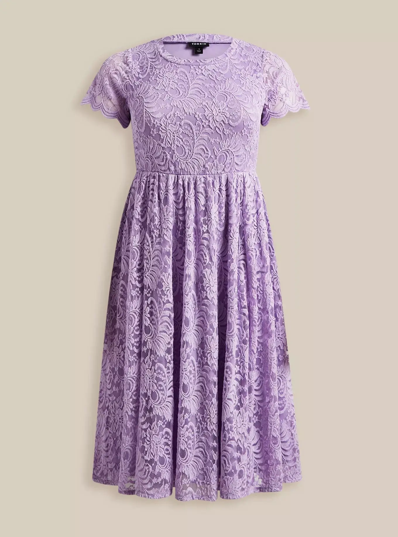 This is a Torrid fit and flare midi dress in a beautiful lavender colour. The dress is made of lace and is perfect for a special occasion or a night out. It's a stylish and comfortable dress that will make you feel confident and beautiful!