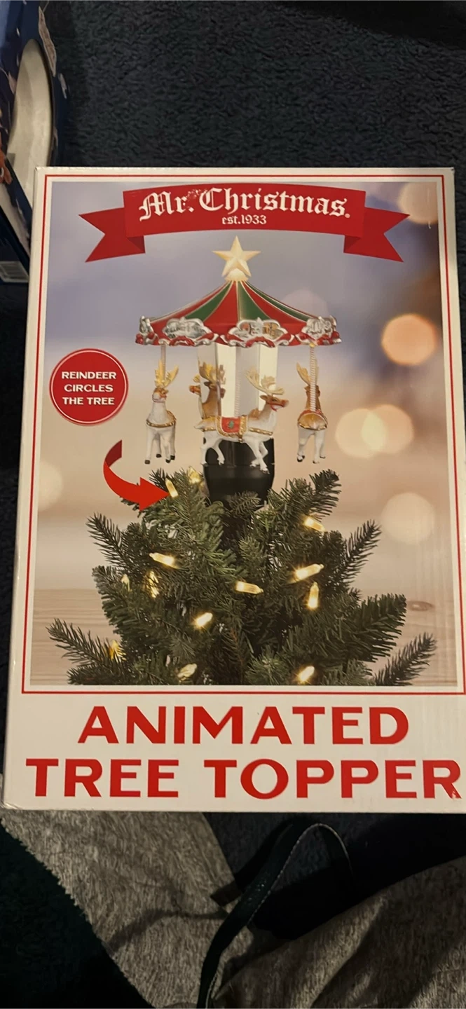 Selling a Mr. Christmas Animated Tree Topper! It's a carousel style topper that's perfect for adding some festive cheer to your Christmas tree. The box shows it has an LED illuminated star and is adapter operated. The reindeer circle the tree for a fun animated effect! Can send video of it working or click Facebook link below to see it working. Cash and pick up only no trades