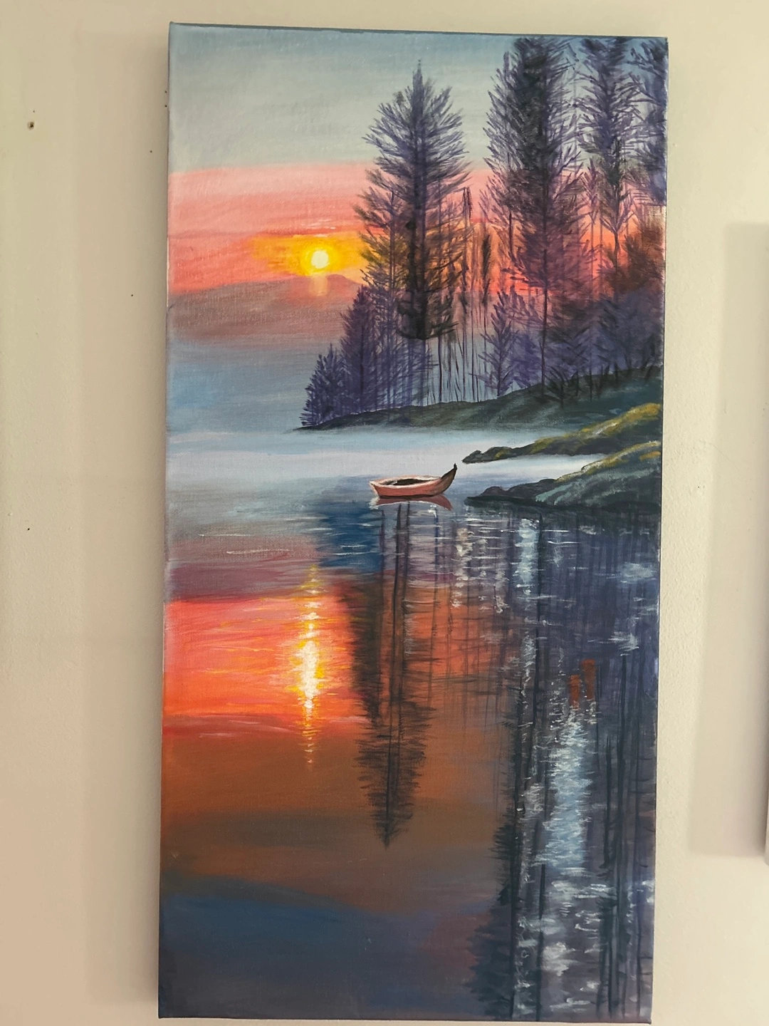An original landscape painting. Handmade. The sunset over the water is a wonderful view. Perfect for bringing a little peace to your home. Painting depicts a lake scene with trees and a boat.