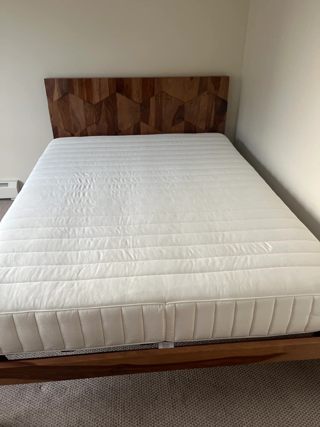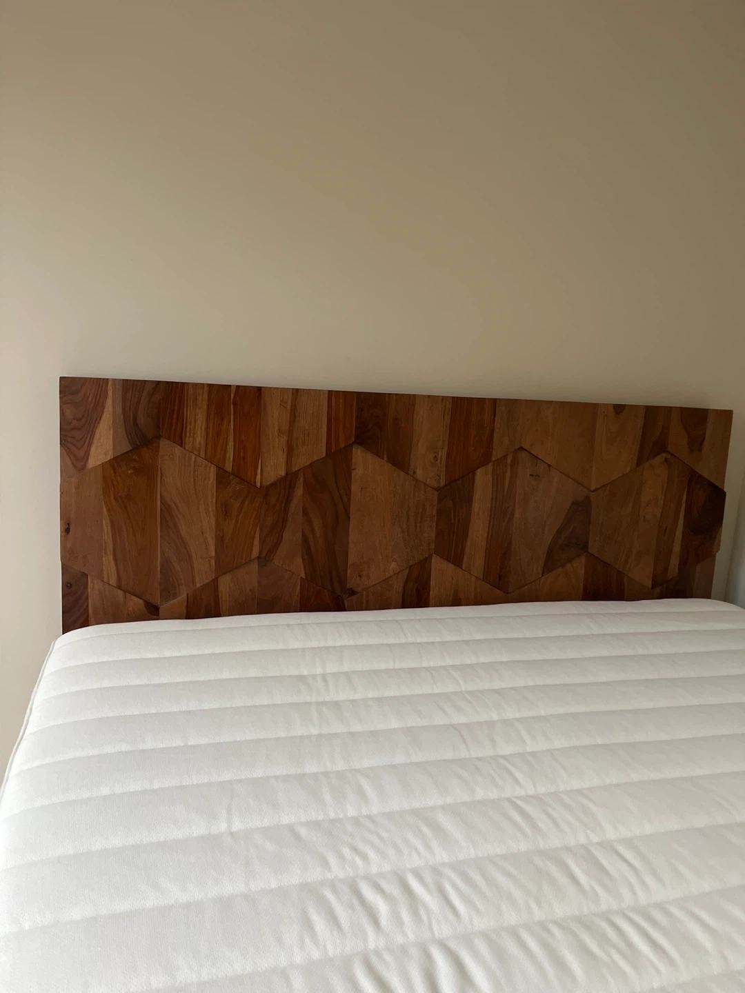 Selling a queen size bed frame with a unique geometric headboard. The frame is made of wood and has a mid-century modern design. It's in great condition and would be a stylish addition to any bedroom