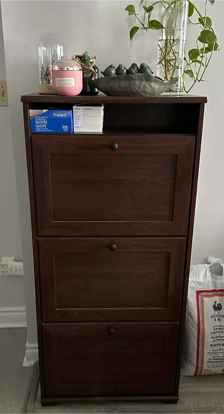 Dark wood cabinet with three flip-down doors. It's perfect for storing shoes or other household items. Unit measures approximately 23" wide x 10" deep x 45" tall.