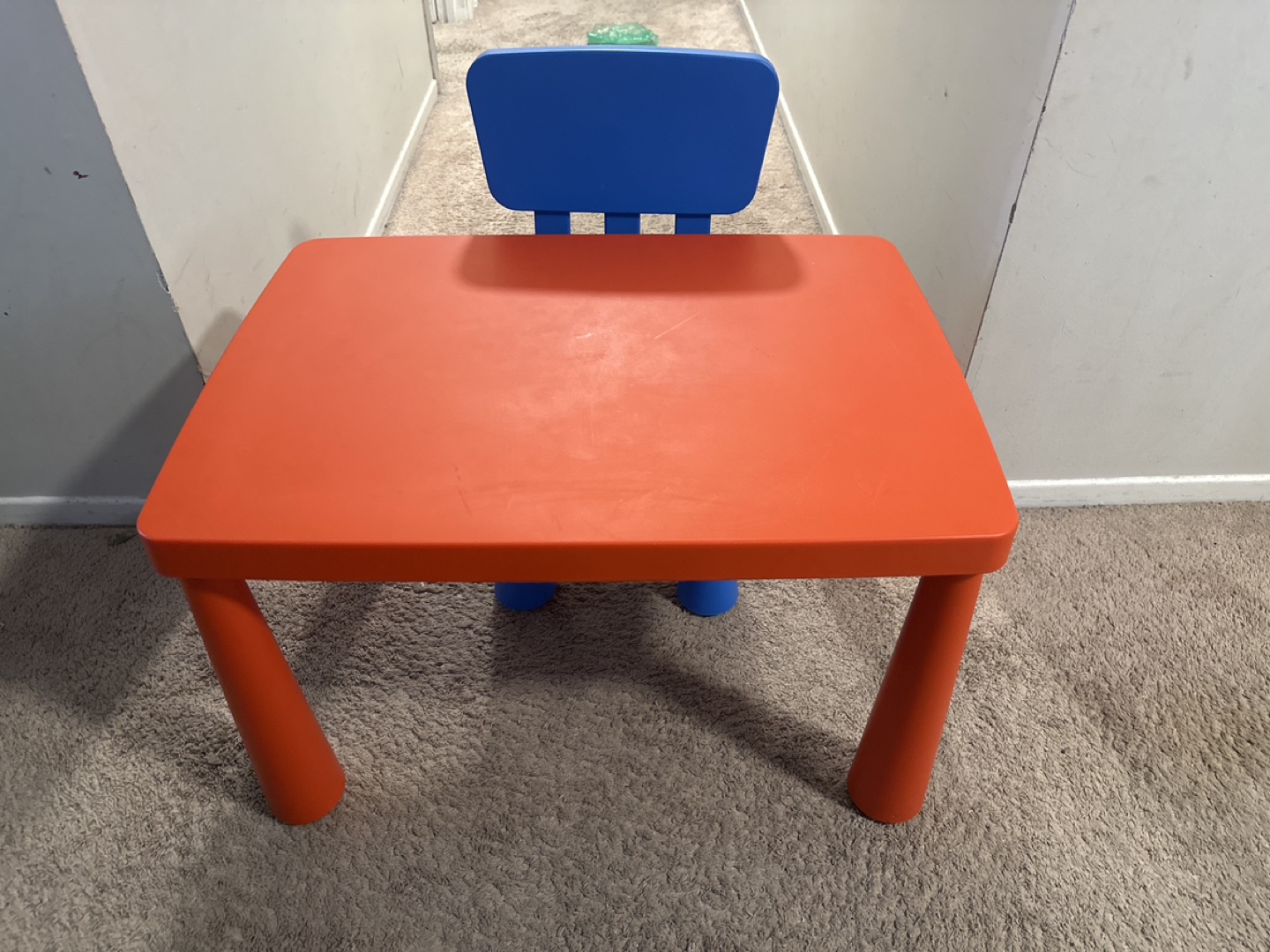 Orange table and blue chair. Plastic construction. Lightweight and easy to clean. Perfect for toddlers and preschoolers.