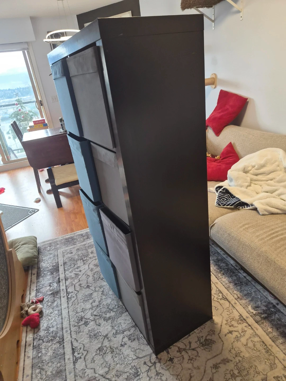 Selling a used IKEA Kallax shelf unit in black-brown. There are some scratches/damage on the top surface, but overall it's still in good condition and very functional for storage or display
