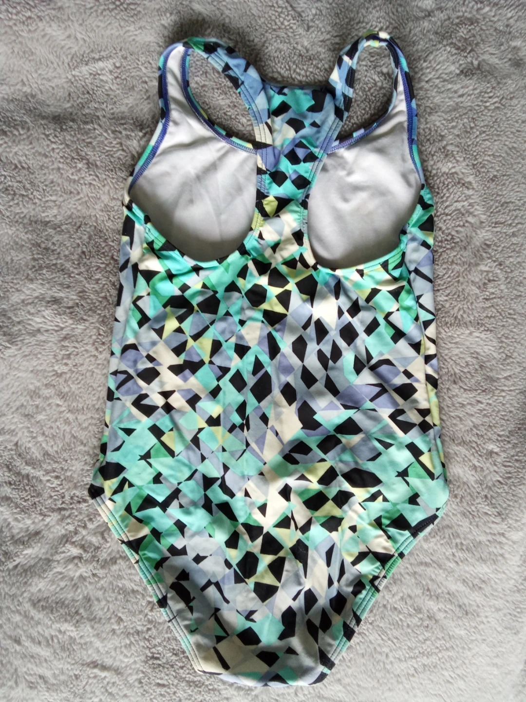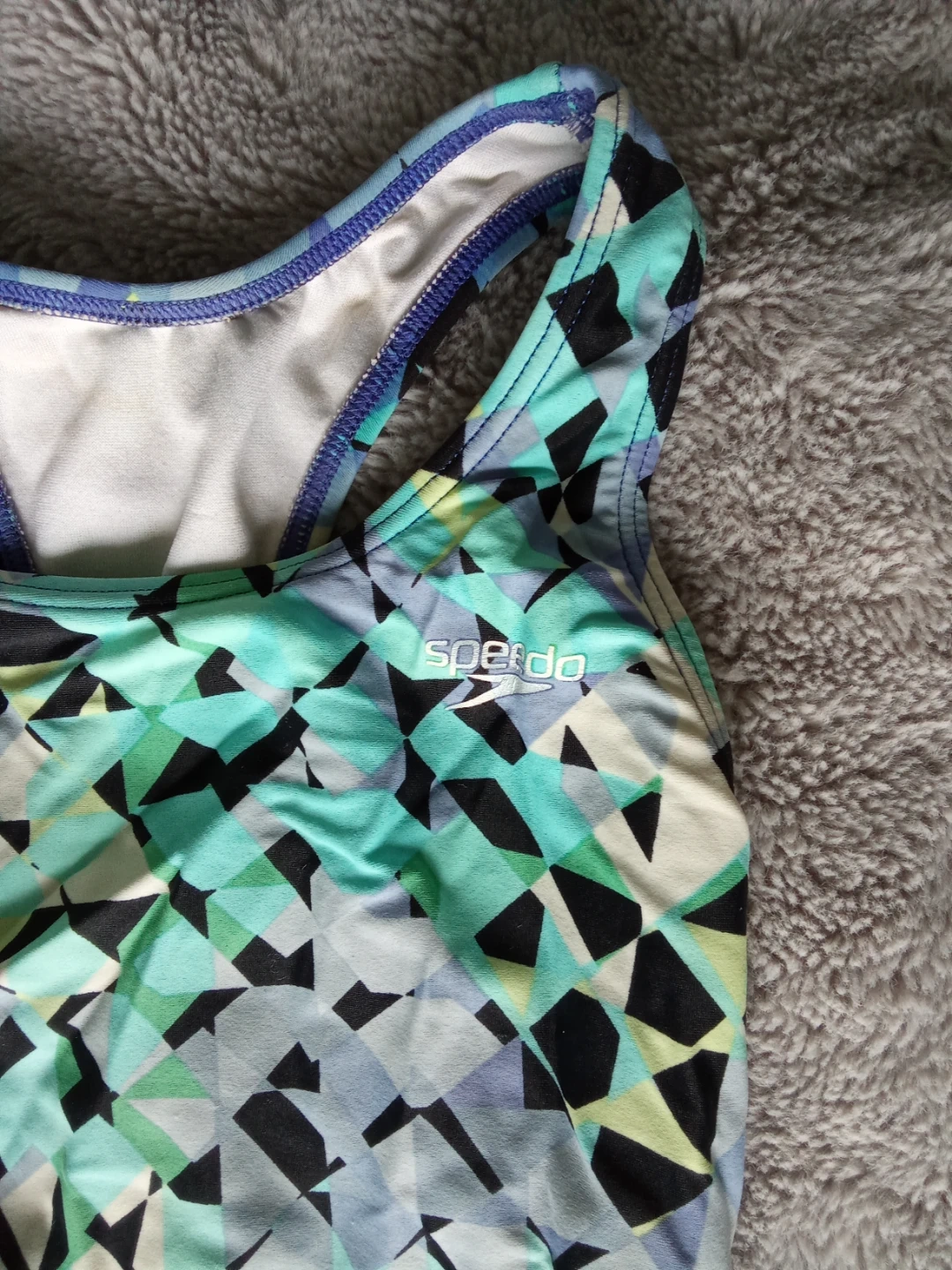 This Speedo one-piece swimsuit has a colourful geometric pattern. It's designed for active wear with a racerback style. Perfect for swimming lessons or recreational use!