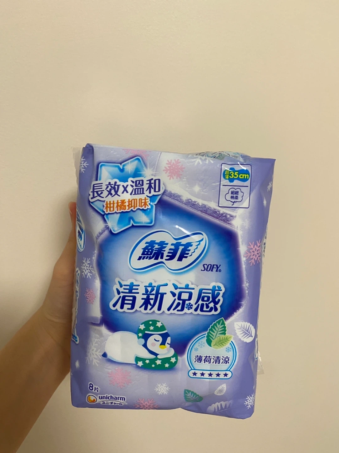 Sofy sanitary pads with a fresh cool sensation. Features long-lasting and gentle odour control. Includes 8 pads, each measuring 35cm. The mint cooling sensation is refreshing.