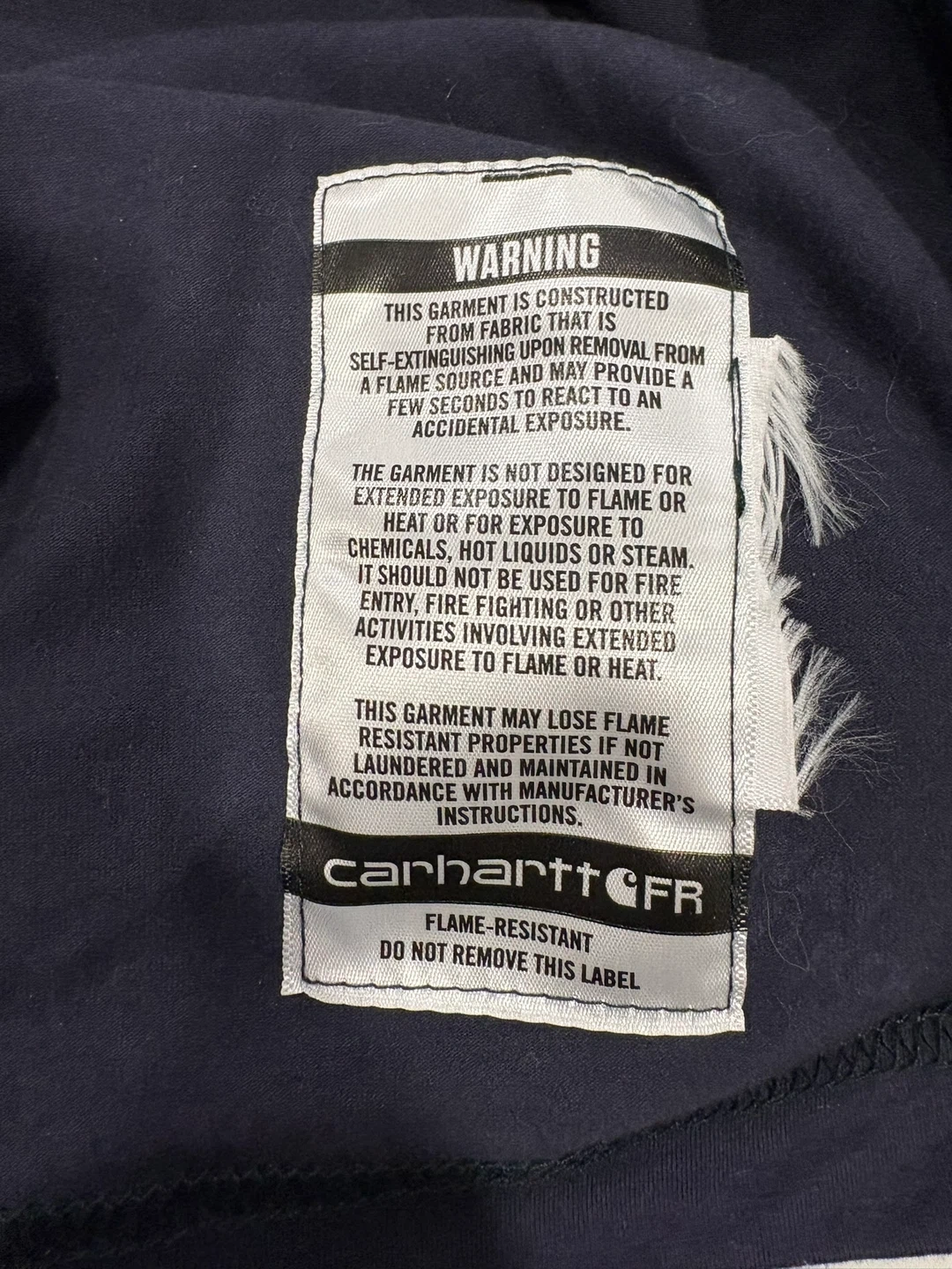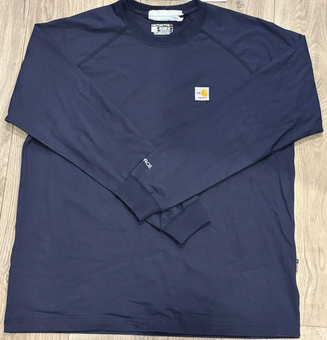 This Carhartt flame-resistant long sleeve t-shirt is navy and size L. It's built to serve and protect hardworking people. The garment is constructed from fabric that is self-extinguishing upon removal from a flame source. It's made in Nicaragua. Stains on sleeve
