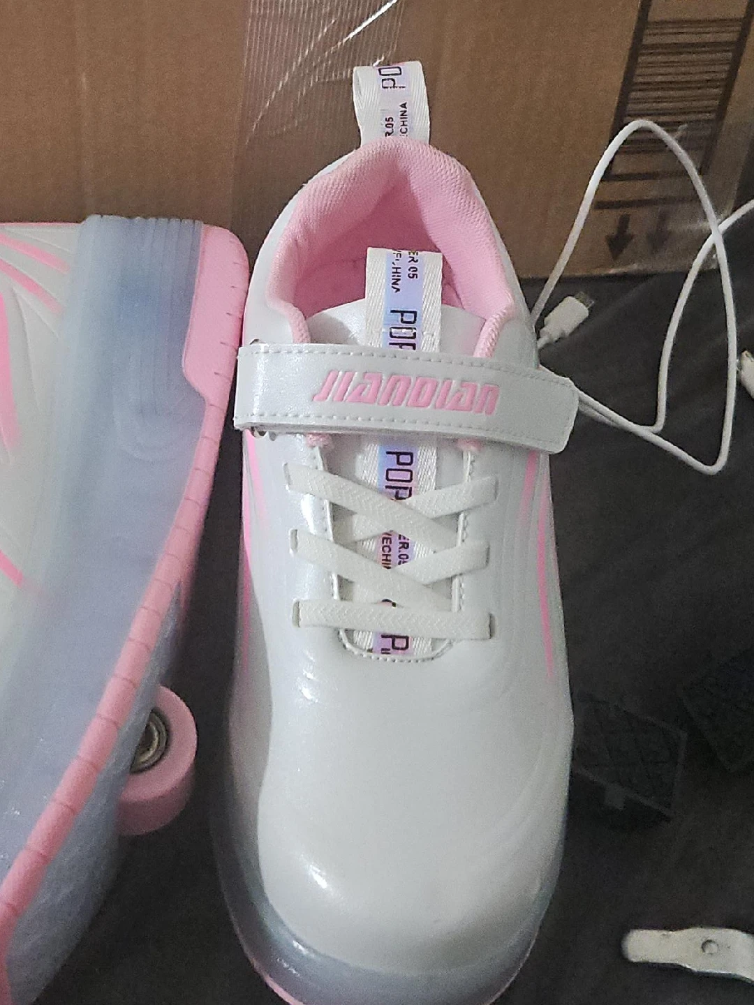 4Cute JianDian roller skate shoes in white and pink! These shoes have retractable wheels so they can be used as regular sneakers too. Comes with the tool to retract the wheel, so you can switch between skating and walking anytime size 36