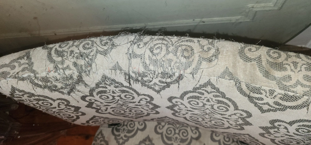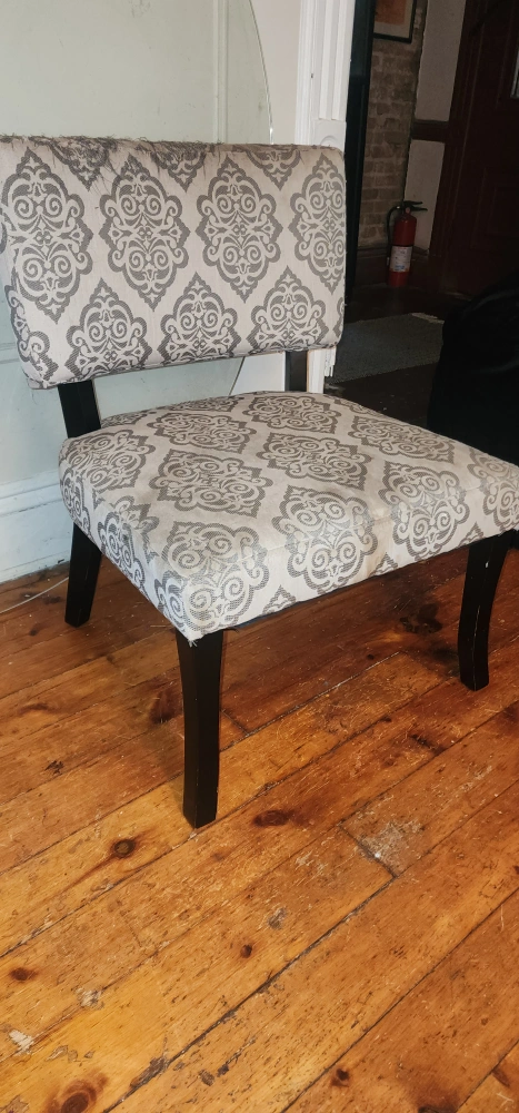 Beautiful accent chair. Features a patterned, upholstered seat and backrest. The chair has wooden legs. It would make a great addition to a cozy reading nook. Could also be easily reupholstered.