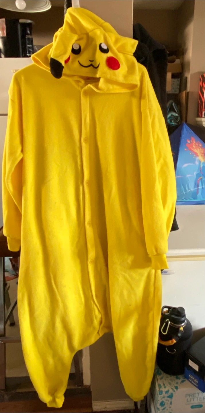 Brand new out of the package Pikachu onesie! It's a fun and cozy piece, perfect for lounging around at home or for a costume party. It's yellow with brown accents and a hood. OBO