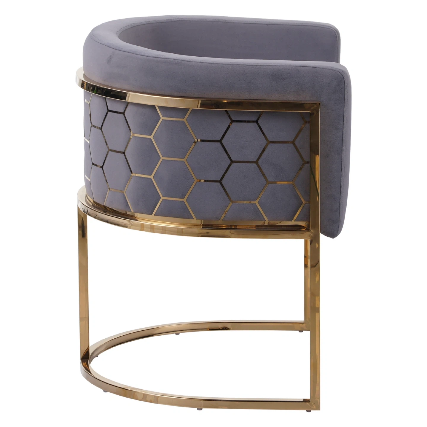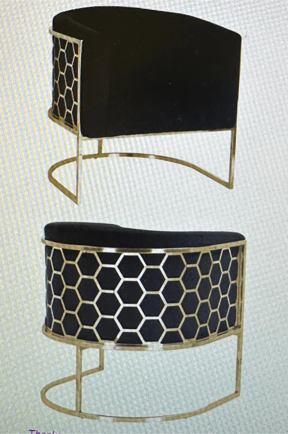 Looking to add a touch of modern elegance to your space? Check out this stylish accent chair! It features a sleek black cushion and a striking gold-tone metal frame with a unique honeycomb pattern. Perfect for a living room, bedroom, or office nook