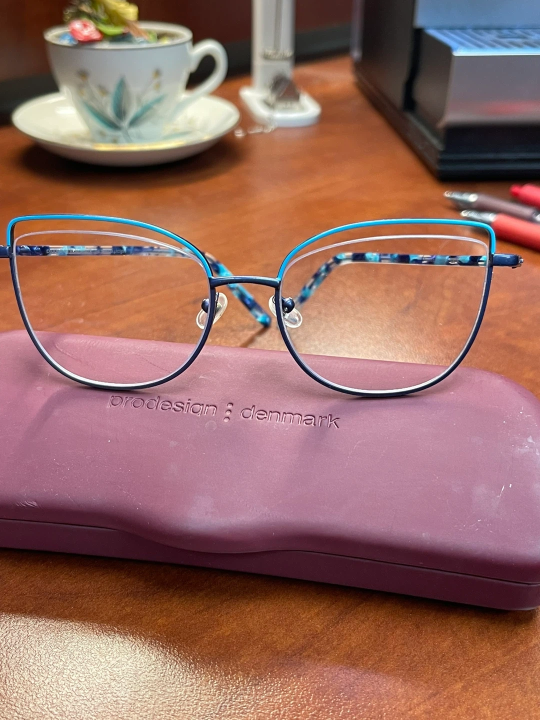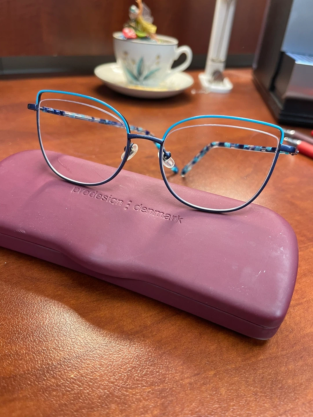Selling a pair of Prodesign Denmark eyeglasses with blue light built-in Plano lenses.you can also put prescription lenses into them. They come with the case as pictured. The frames are a stylish blue and navy colour.