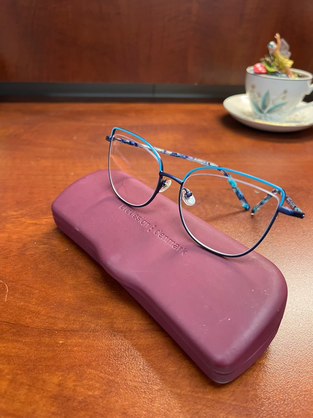 Selling a pair of Prodesign Denmark eyeglasses with blue light built-in Plano lenses.you can also put prescription lenses into them. They come with the case as pictured. The frames are a stylish blue and navy colour.