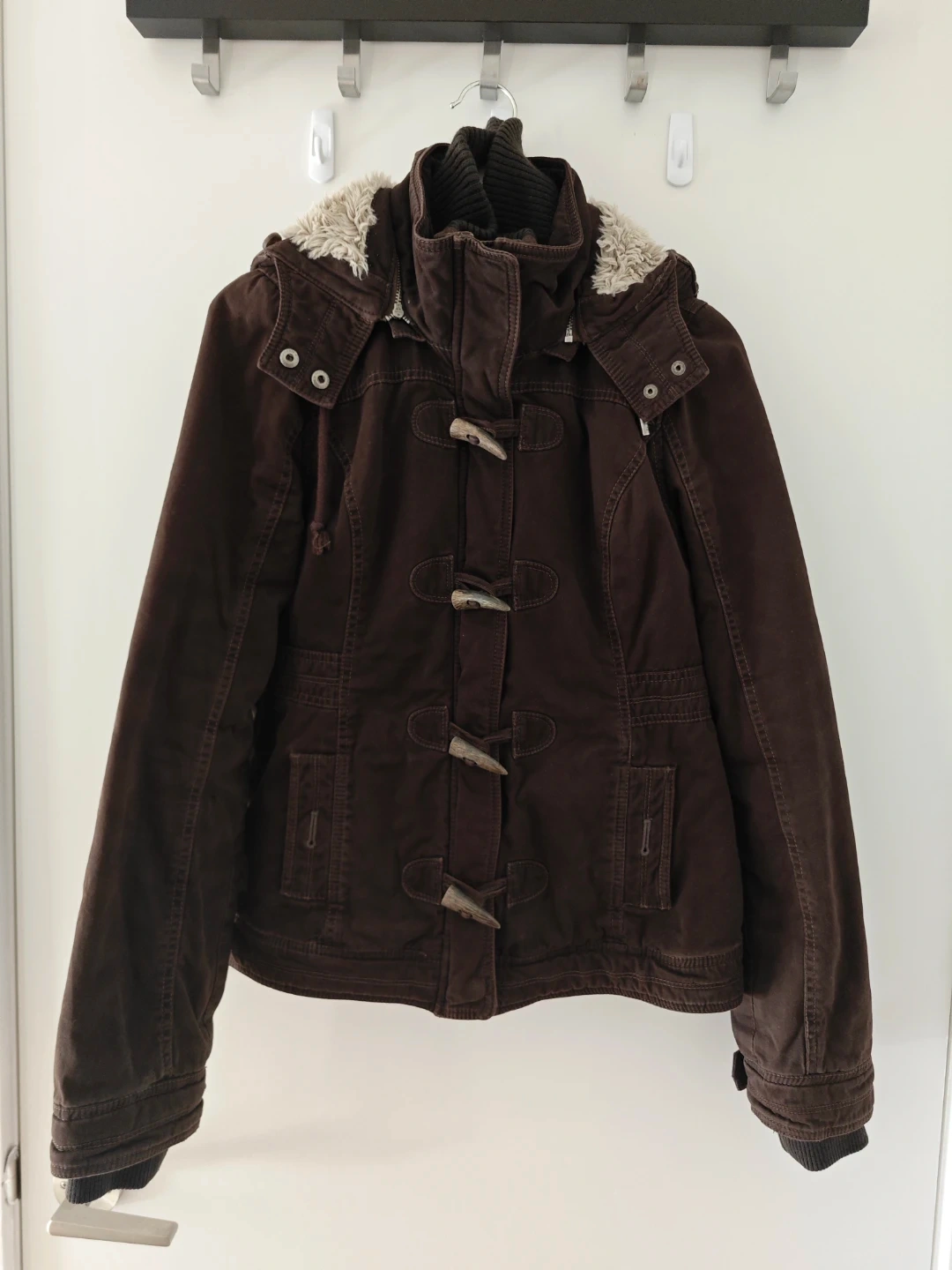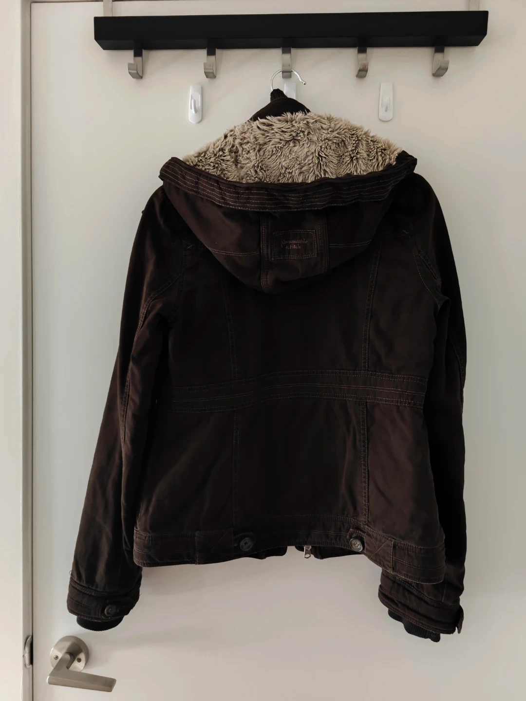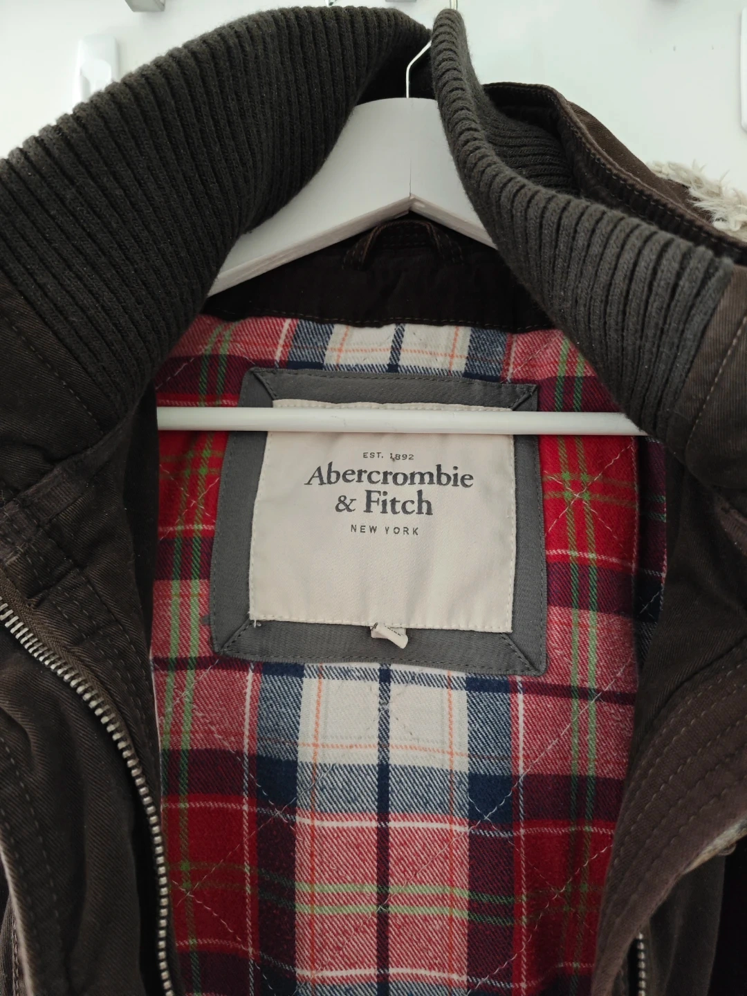 Size is M. This brown Abercrombie & Fitch jacket features a cozy plaid lining and toggle closures. It has a faux fur-lined hood for extra warmth. The exterior is a durable canvas material.