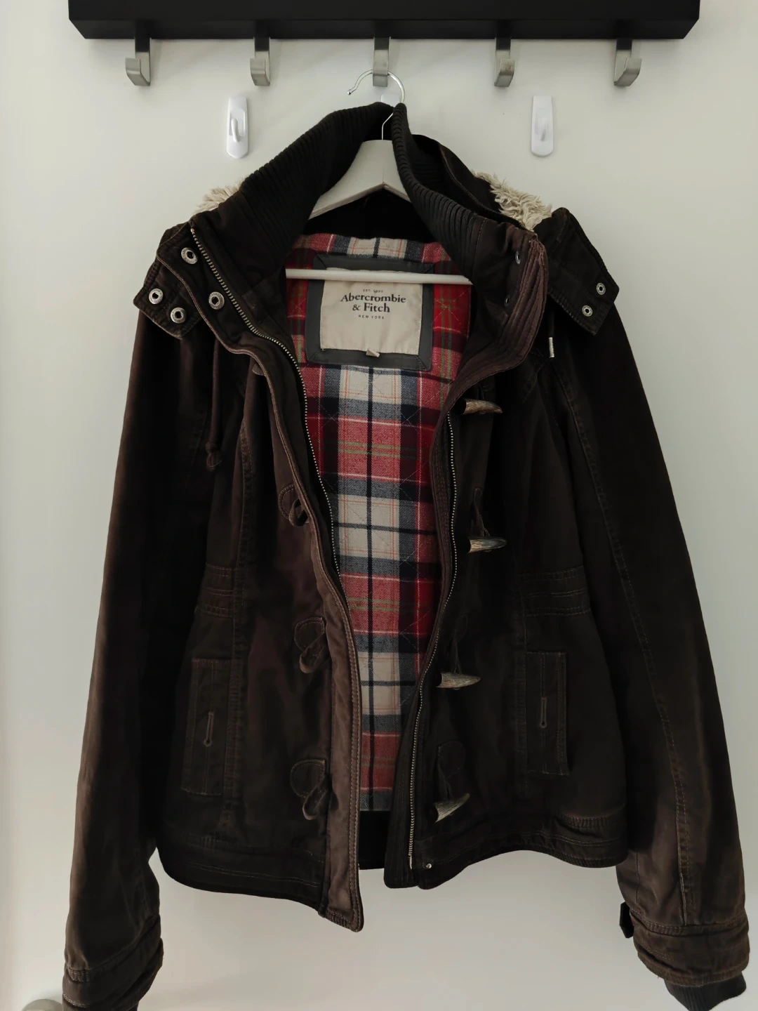 Size is M. This brown Abercrombie & Fitch jacket features a cozy plaid lining and toggle closures. It has a faux fur-lined hood for extra warmth. The exterior is a durable canvas material.