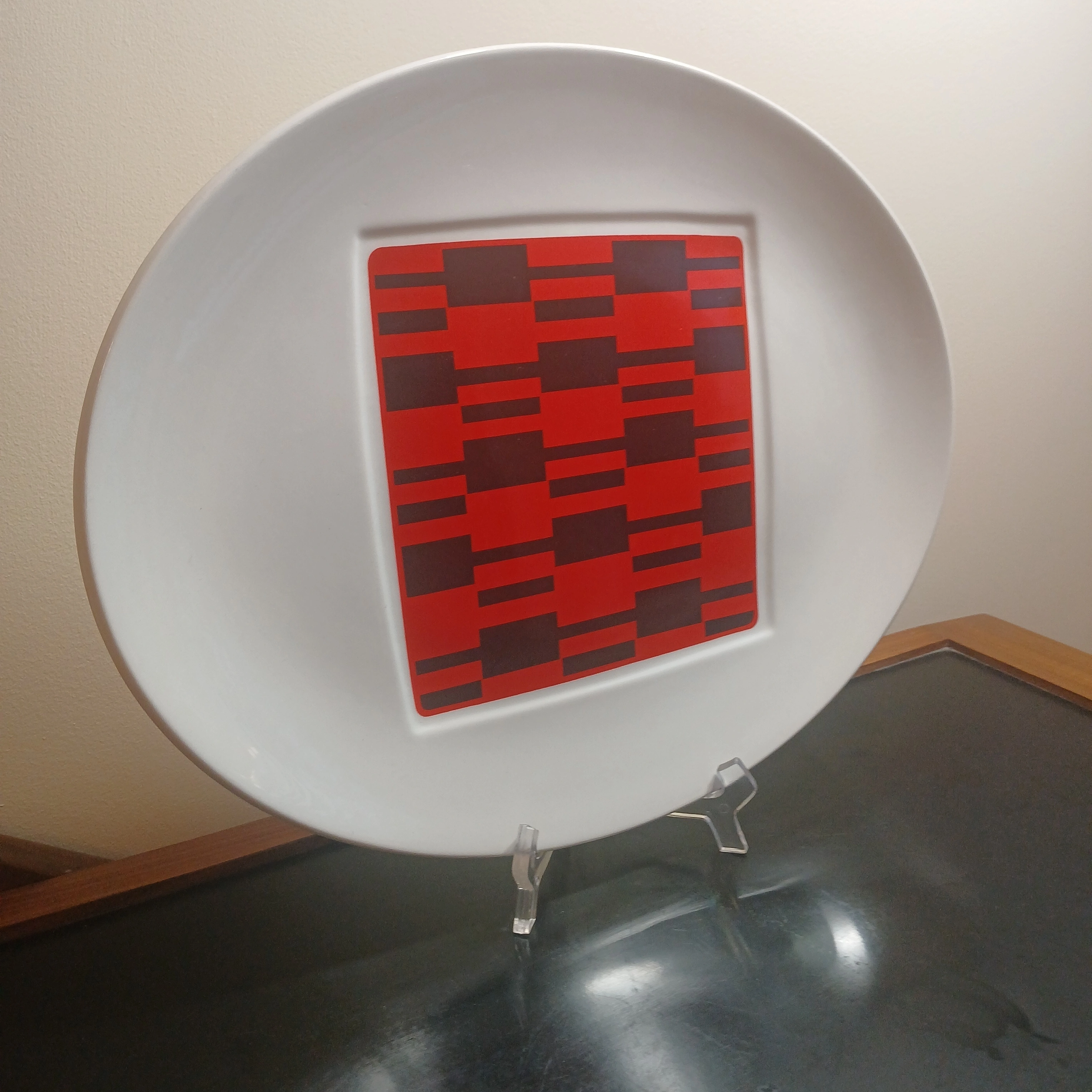 The Mid Century Johnson Brothers Khayyam Pattern Platter is not just a piece of dinnerware; it is a stunning testament to the artistry and innovation of mid-century modern design. Crafted from durable ironstone in England, this vintage platter showcases a captivating geometric pattern of rich brown blocks and bars against a vibrant red square inset, making it a striking centerpiece for any table setting.