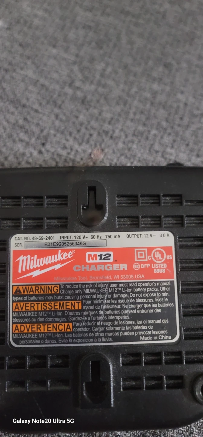 Selling my Milwaukee M12 Li-ion battery charger. Input 120 V~, 60 Hz, 750 mA. Output 12 V, 3.0 A. Model C1402.
