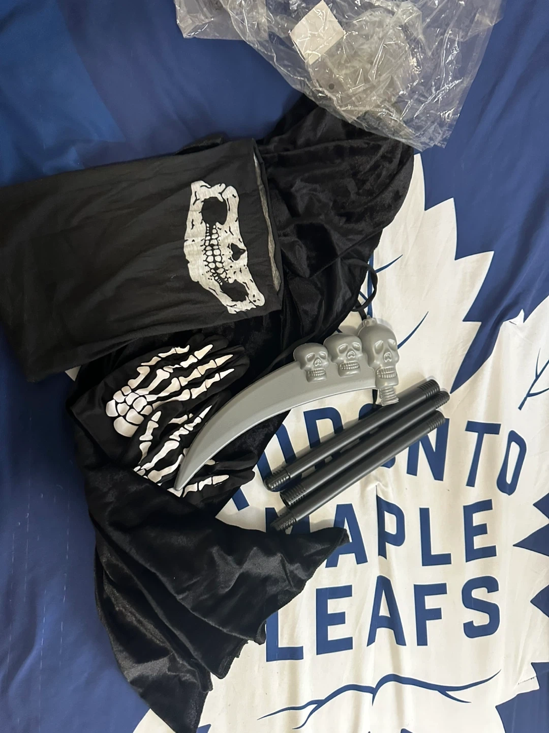 Get ready for Halloween with this Grim Reaper costume! Includes the black robe with a skull design, skeleton gloves, and a scythe that assembles easily. Perfect for a spooky night out!