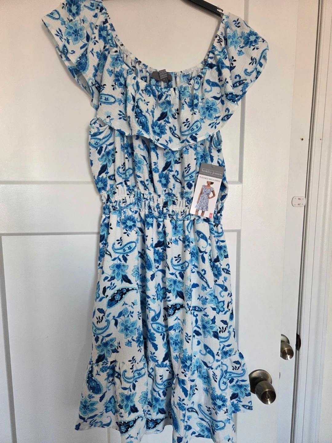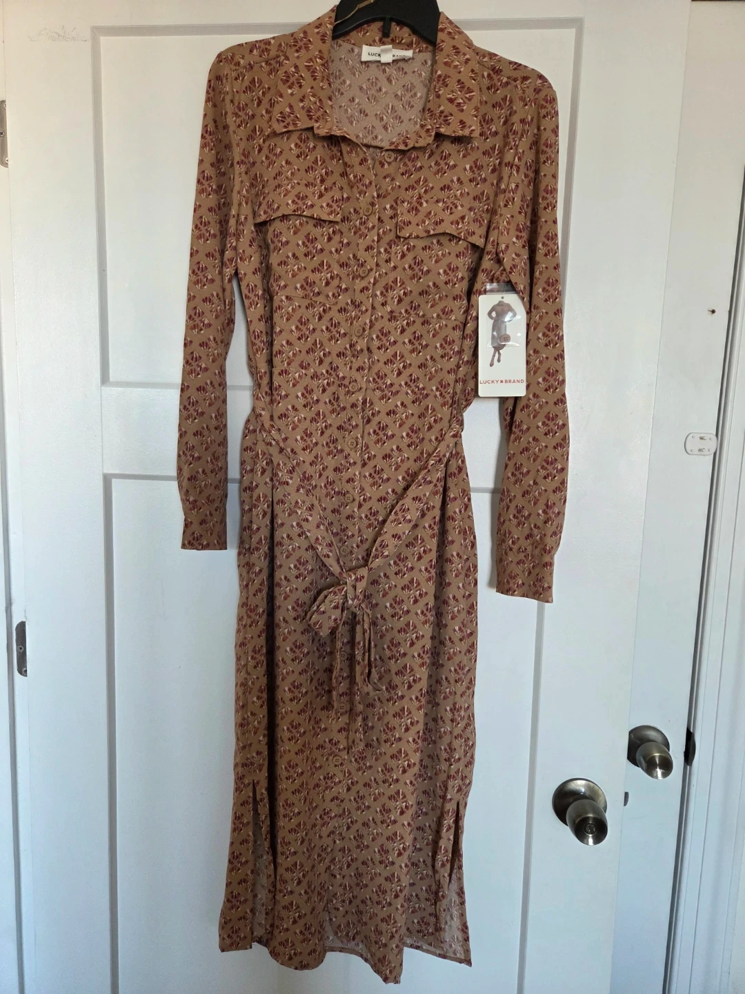 This is a floral print midi dress from Lucky Brand. It's a tan color with a repeating red floral pattern. The dress has a collared neckline and a tie belt. It's perfect for a casual outing or can be dressed up for a more formal occasion!