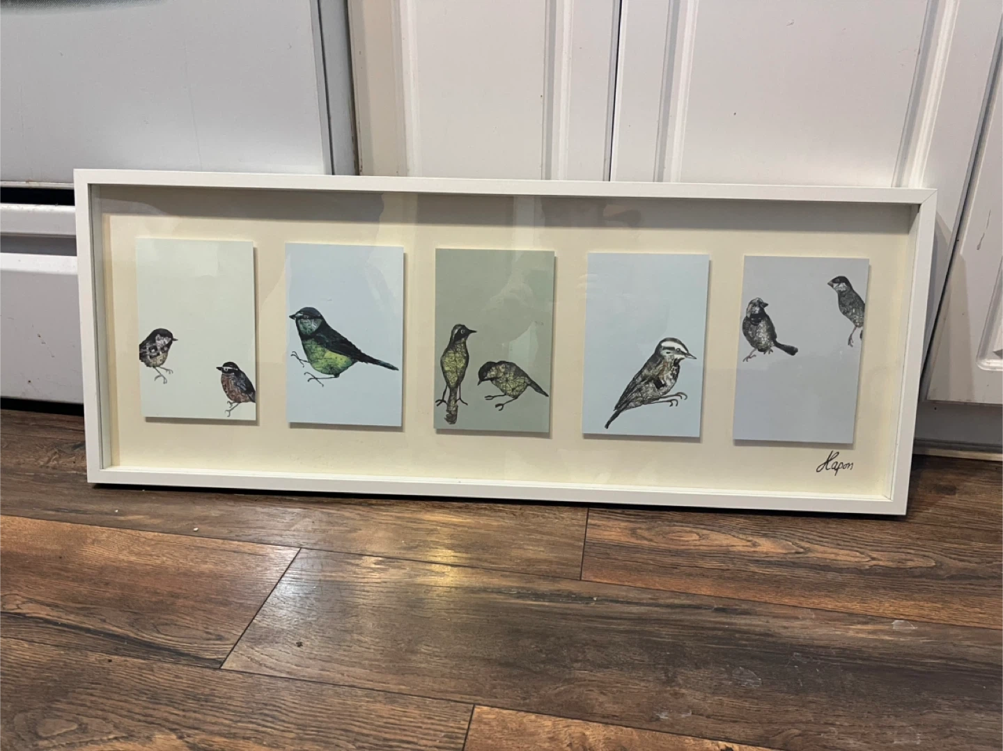 This is an IKEA OLUNDA framed art piece featuring a collection of birds. It's a lovely addition to any room. The frame is white and it's a long, horizontal piece. Great condition!