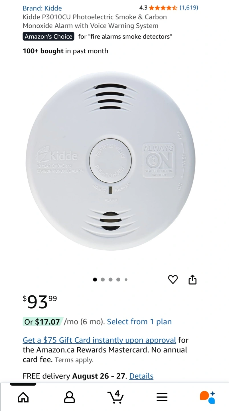 Selling a brand new Kidde P3010CU Photoelectric Smoke & Carbon Monoxide Alarm with Voice Warning System. It detects fires quickly and reduces false alarms. The battery never needs changing, and it lasts for 10 years! Originally bought for $93.99
