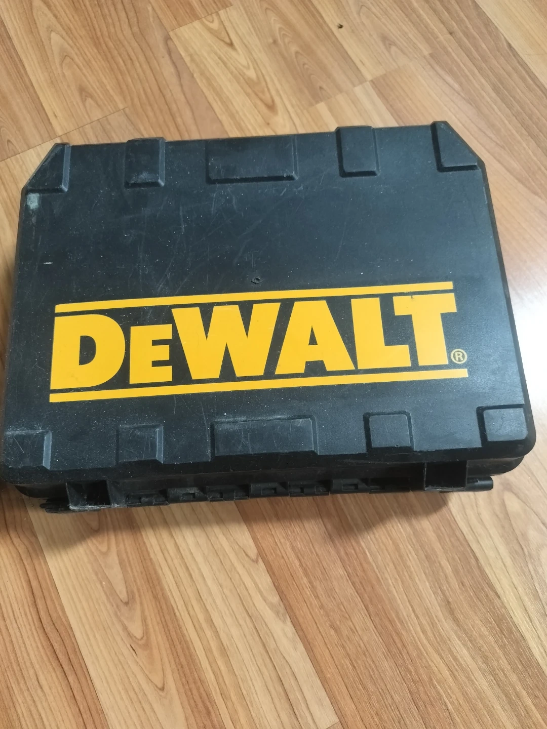 This is a yellow DeWalt corded drill that comes with its original black carrying case. It's a handy tool for various projects around the house! The drill has a cord for power.
