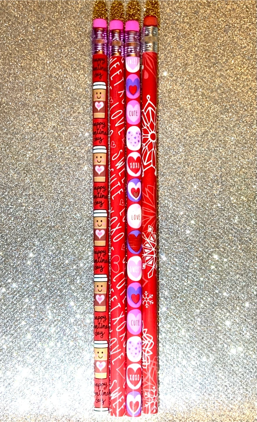 These Valentine's Day theme set of four wooden pencils with a design of coffee cups, hearts, and sweet messages such as 'Happy Valentine's Day', 'Love', and 'XOXO'. Each pencil has a pink eraser and is ready for use!