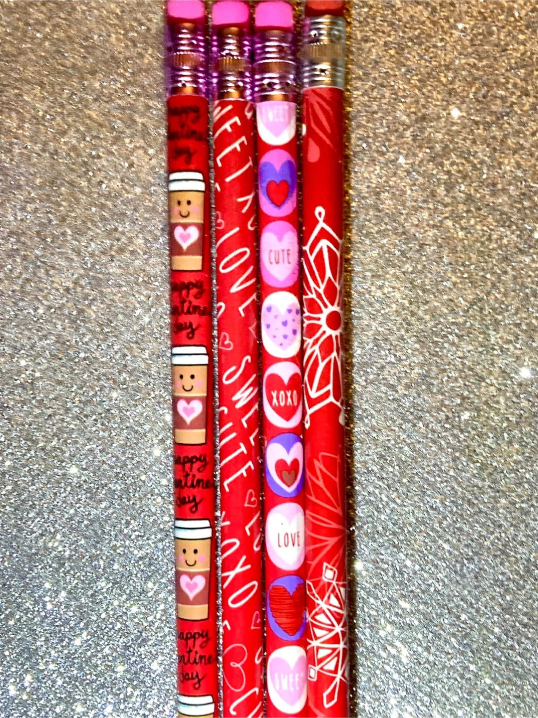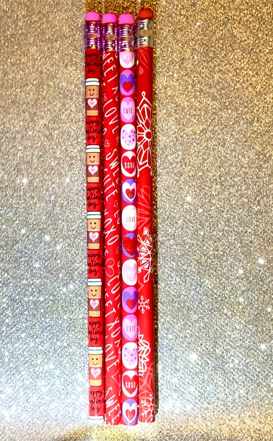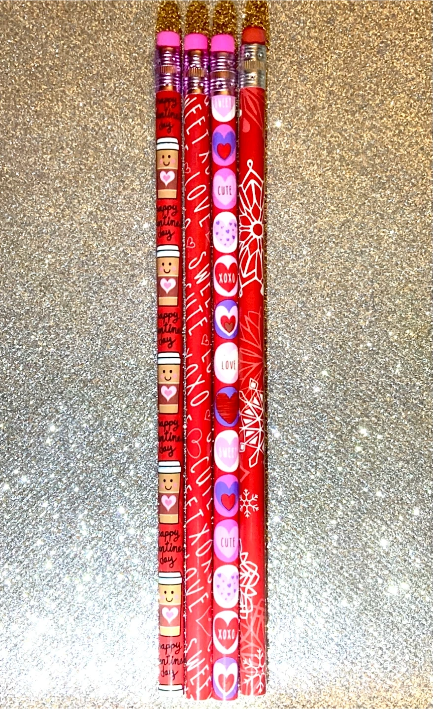 These Valentine's Day theme set of four wooden pencils with a design of coffee cups, hearts, and sweet messages such as 'Happy Valentine's Day', 'Love', and 'XOXO'. Each pencil has a pink eraser and is ready for use!