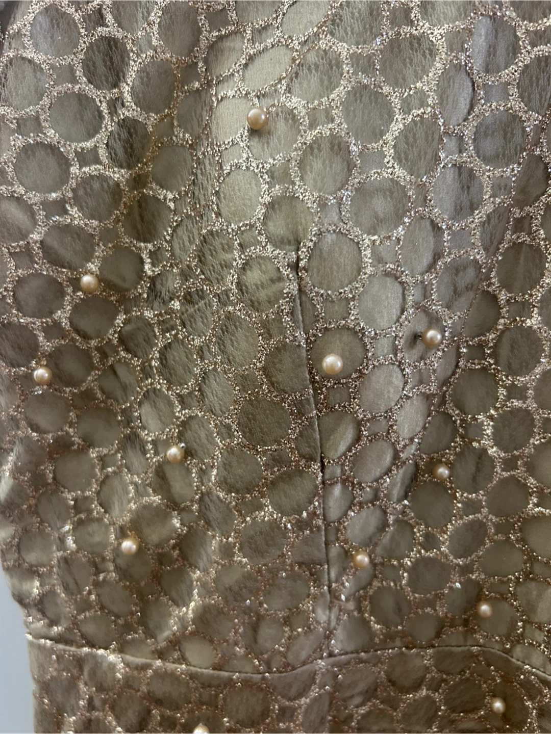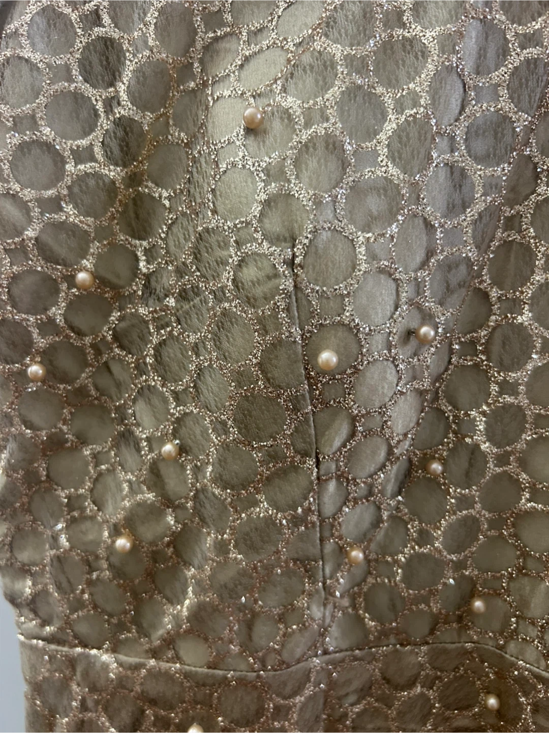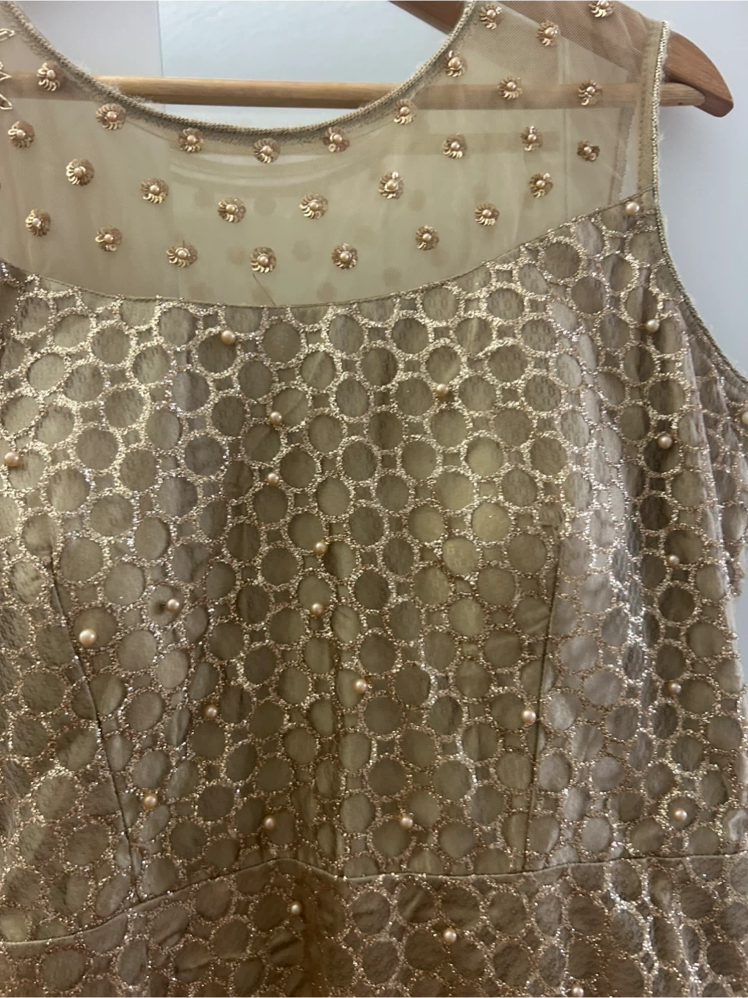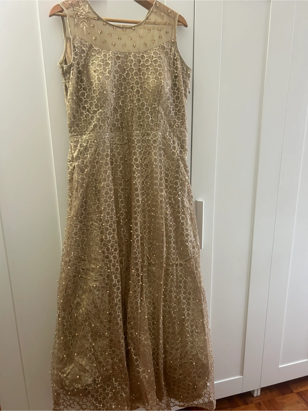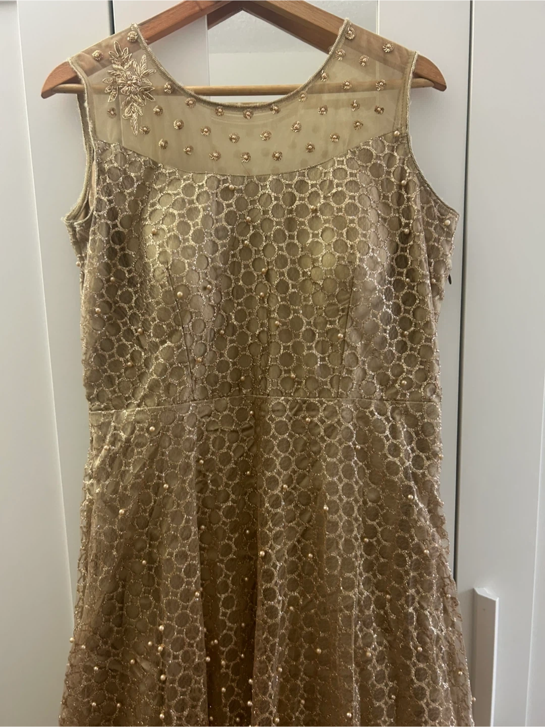 Selling a beautiful gold dress with pearl-like embellishments. It features a sleeveless design and intricate detailing throughout. Perfect for a special occasion!