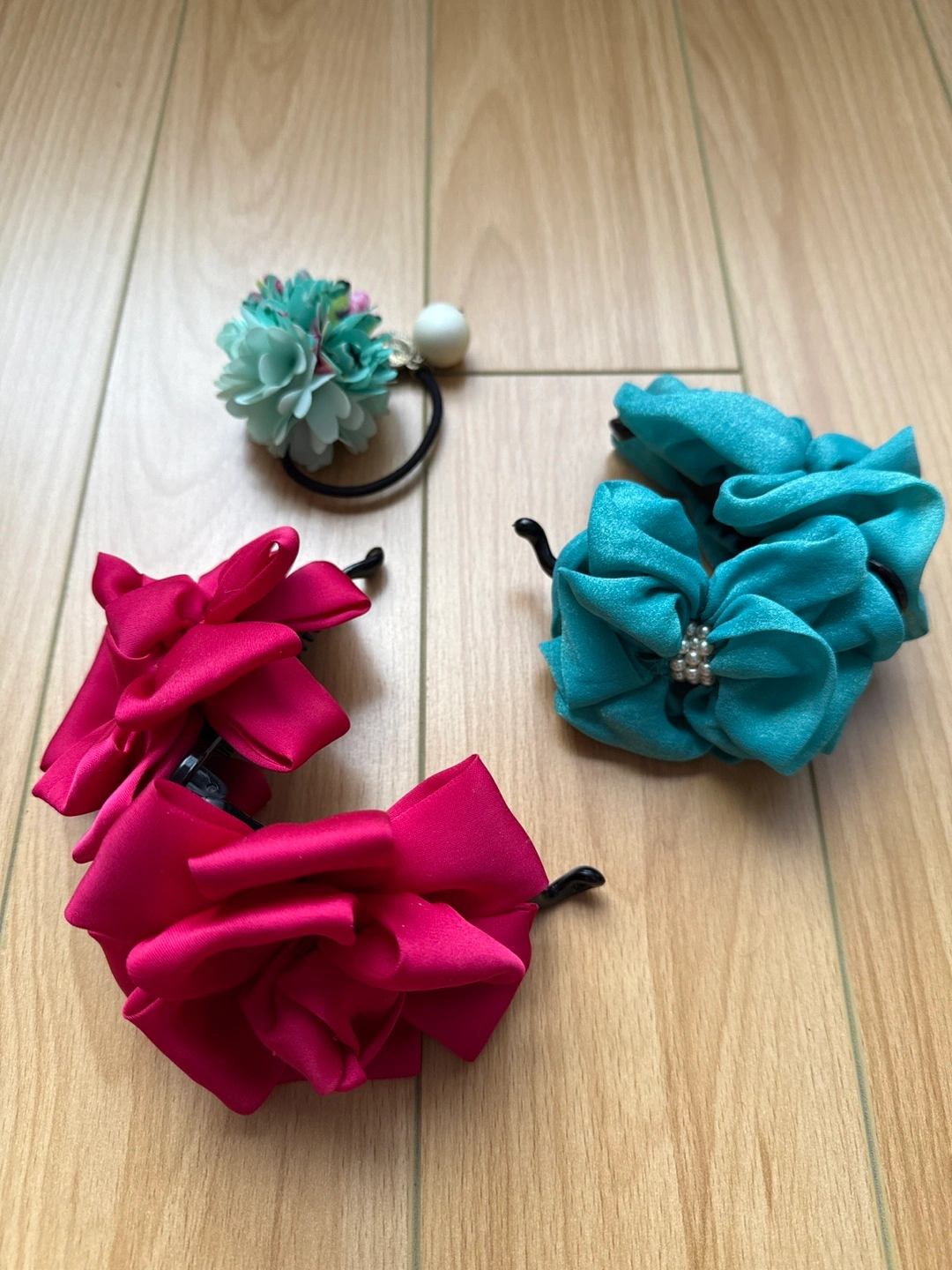 Set of three hair accessories. Two are claw clips with fabric bows, one red and one teal. One is a hair tie with a fabric flower. Great for adding a touch of elegance to any hairstyle.