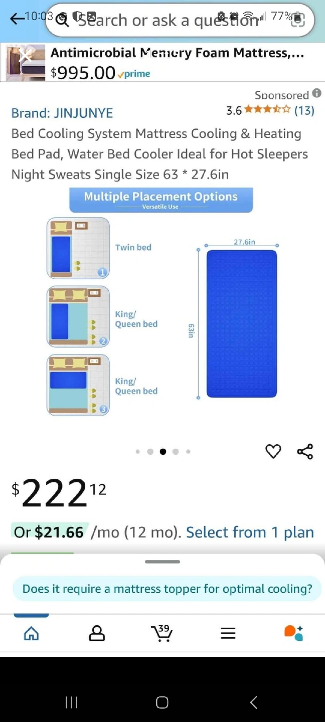 Selling onece time used JINJUNYE Bed Cooling System, ! This mattress cooling and heating pad is perfect for hot sleepers. It's a water bed cooler designed for night sweats. The size is 63 x 27.6 inches, ideal for a single bed. Originally bought for $222.12