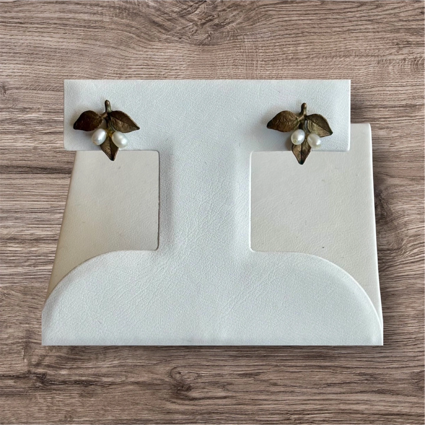 Pretty pair of earrings. Features small leaves and pearls. Unique design. Comes with pouch. Pre-owned.