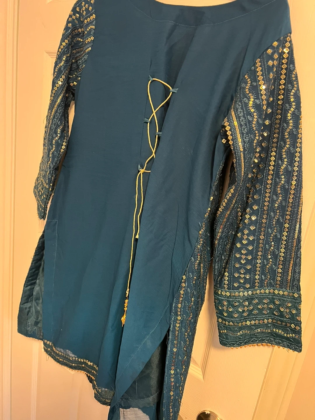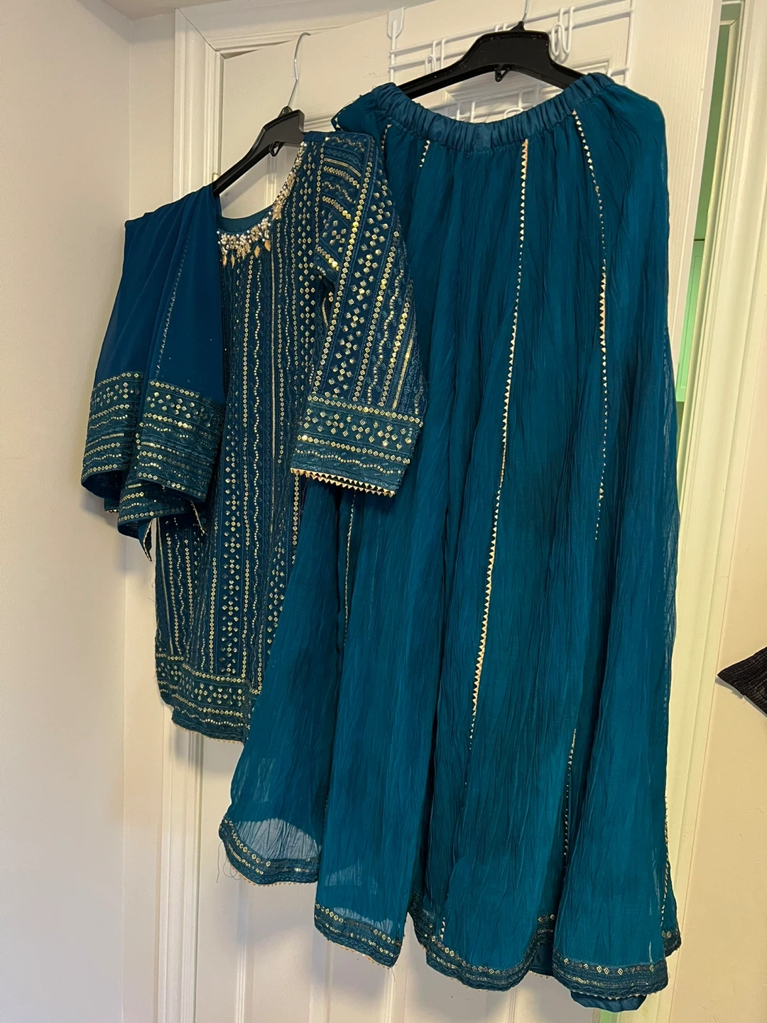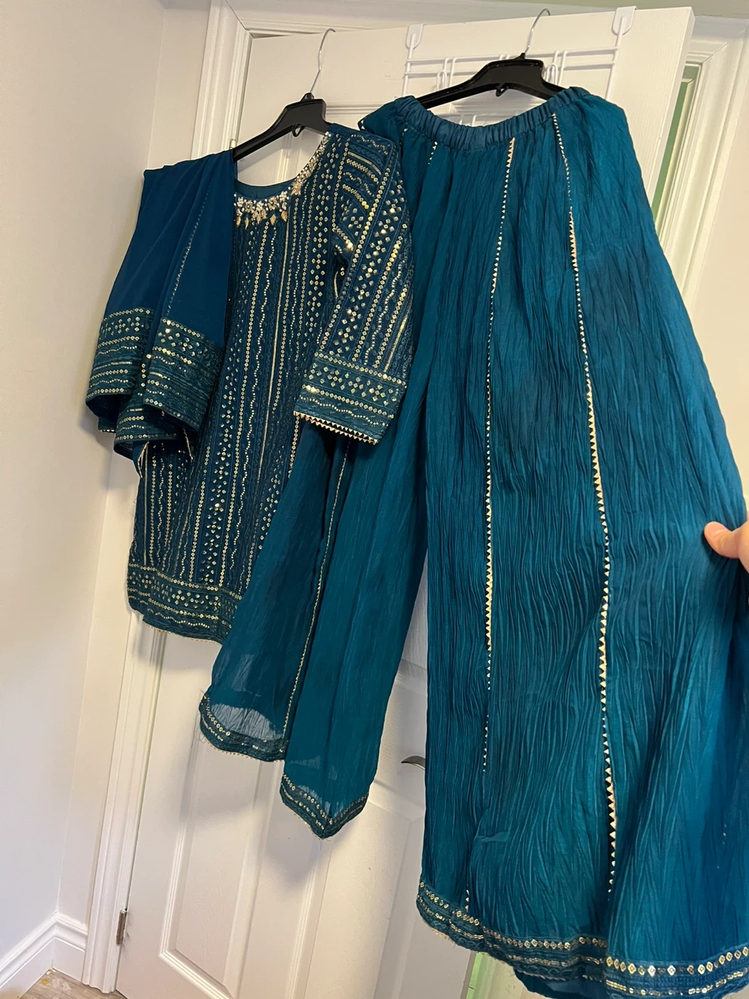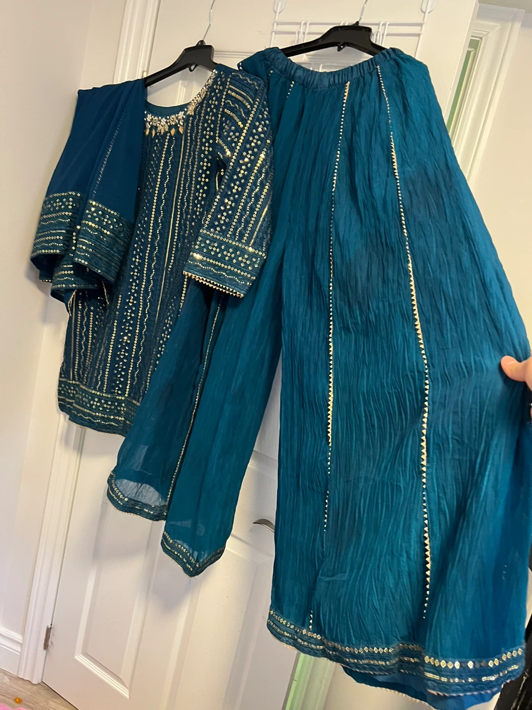 A three-piece outfit featuring a teal kurti with intricate gold embroidery and sequin detailing. It comes with matching wide-leg palazzo pants and a coordinating dupatta. Perfect for special occasions or festive gatherings!