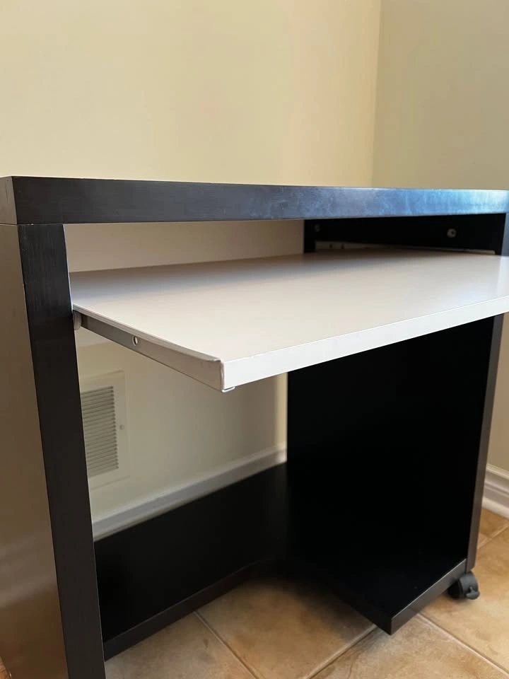 Ikea computer table with pull out keyboard shelf is in excellent condition. Has a lower shelf for a computer hard drive. Measures about 30" wide x 31" high and 19 3/4" deep.