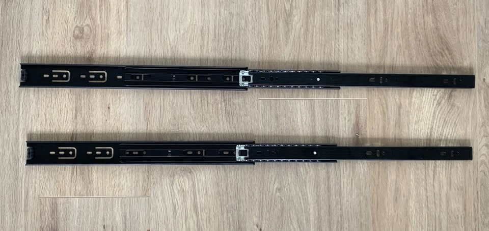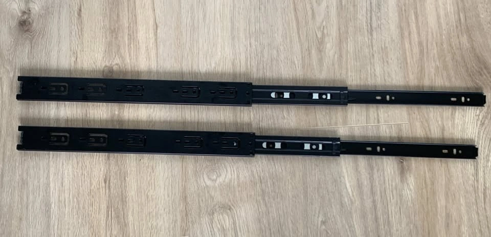 Brand new, never used black drawer slides, 16 inches (40cm) with a 100 LB capacity. They are lightweight and sturdy. Smooth and quiet rolling. Full extension and detachable. From a smoke and pet-free home. Pick up in Willoughby, Langley. CASH ONLY.