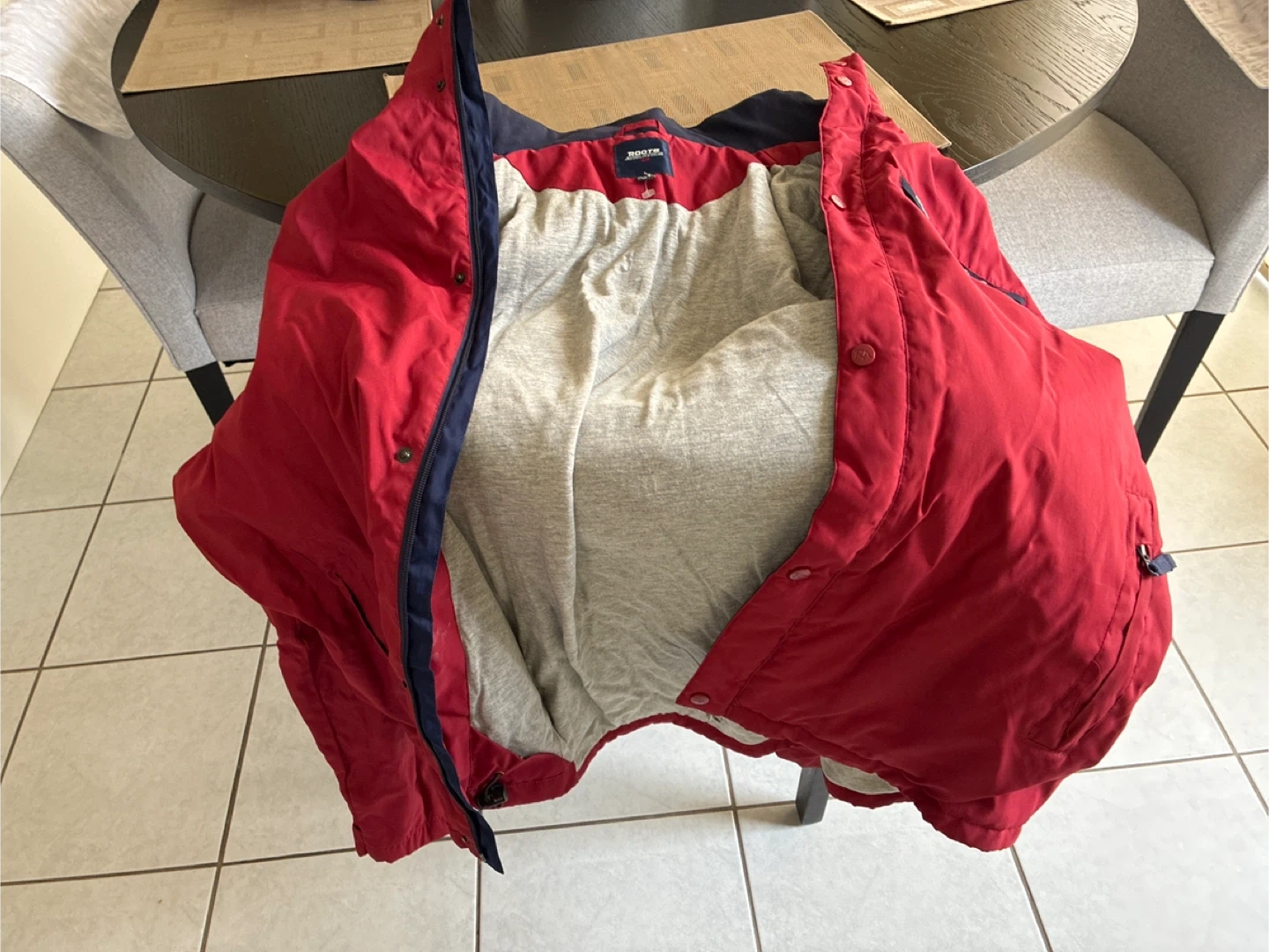 This is a Roots jacket in red with blue accents. It's made with a durable outer shell and a comfortable grey lining. The jacket features a zip and snap closure. Perfect for cooler weather!